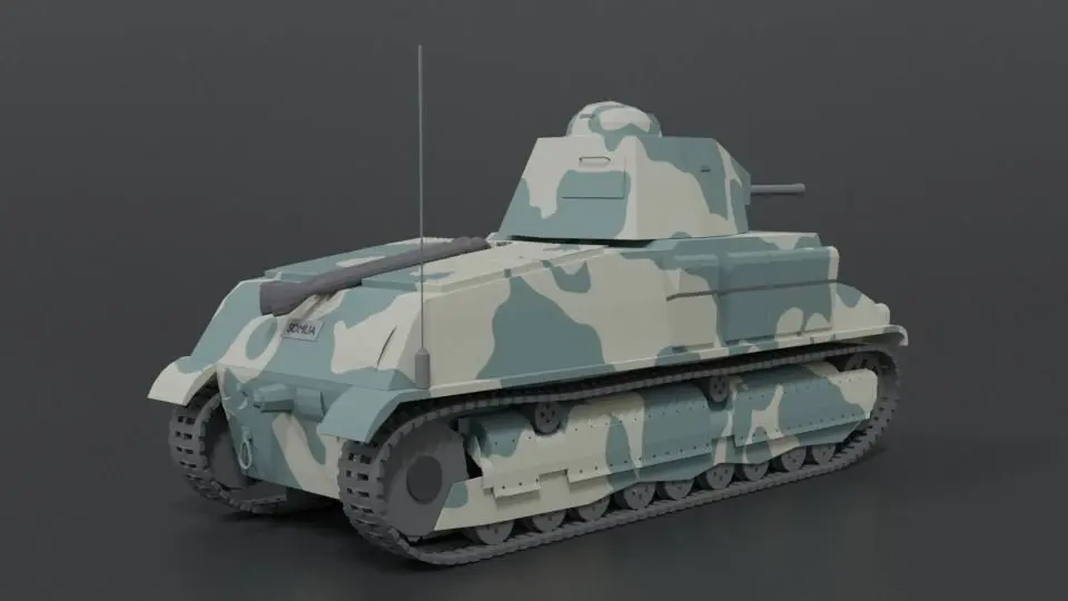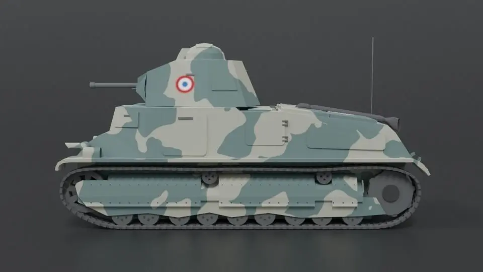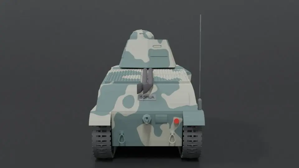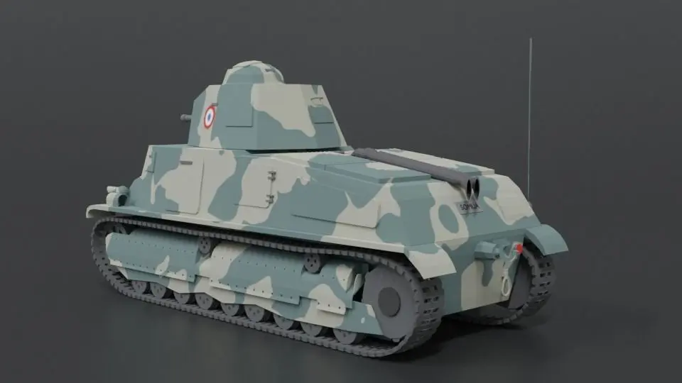 This is a low poly 3d model of a French Somua S35 tank. The low poly tank was modeled and prepared for low-poly style renderings, background, general CG visualization presented as 8 meshes with quads/tris.