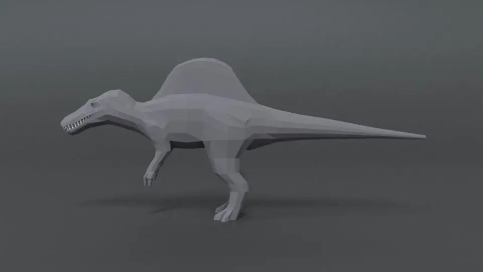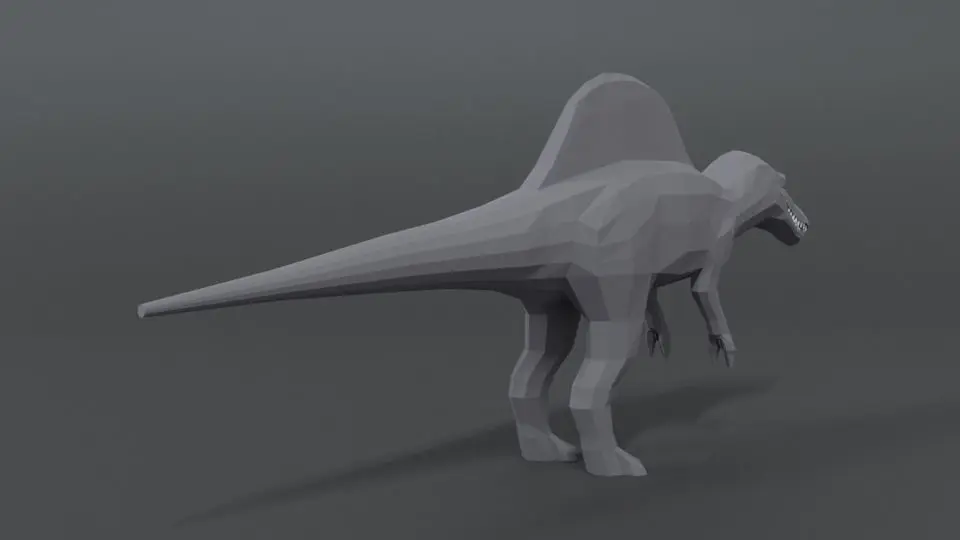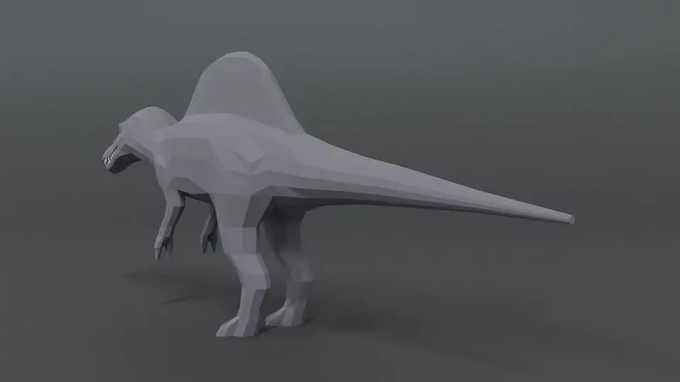This is a low poly 3D model of a spinisaurus. The low poly spinosaurus was modeled and prepared for low-poly style renderings, background, general CG visualization presented as a mesh with quads only.