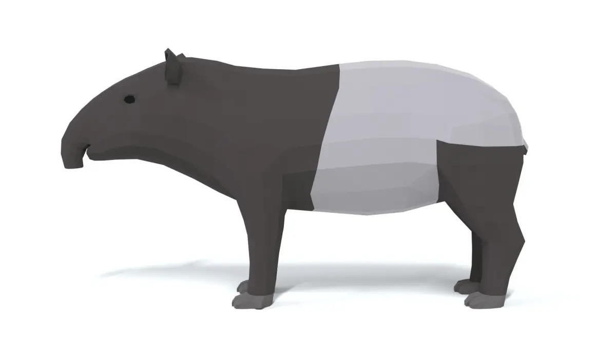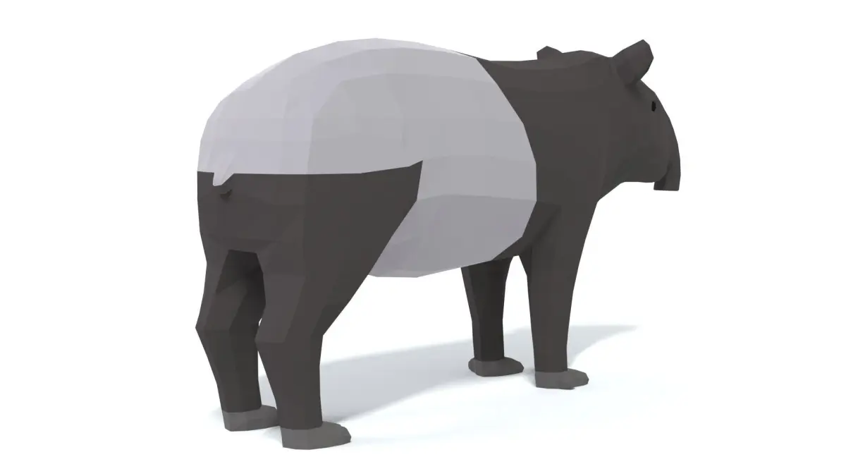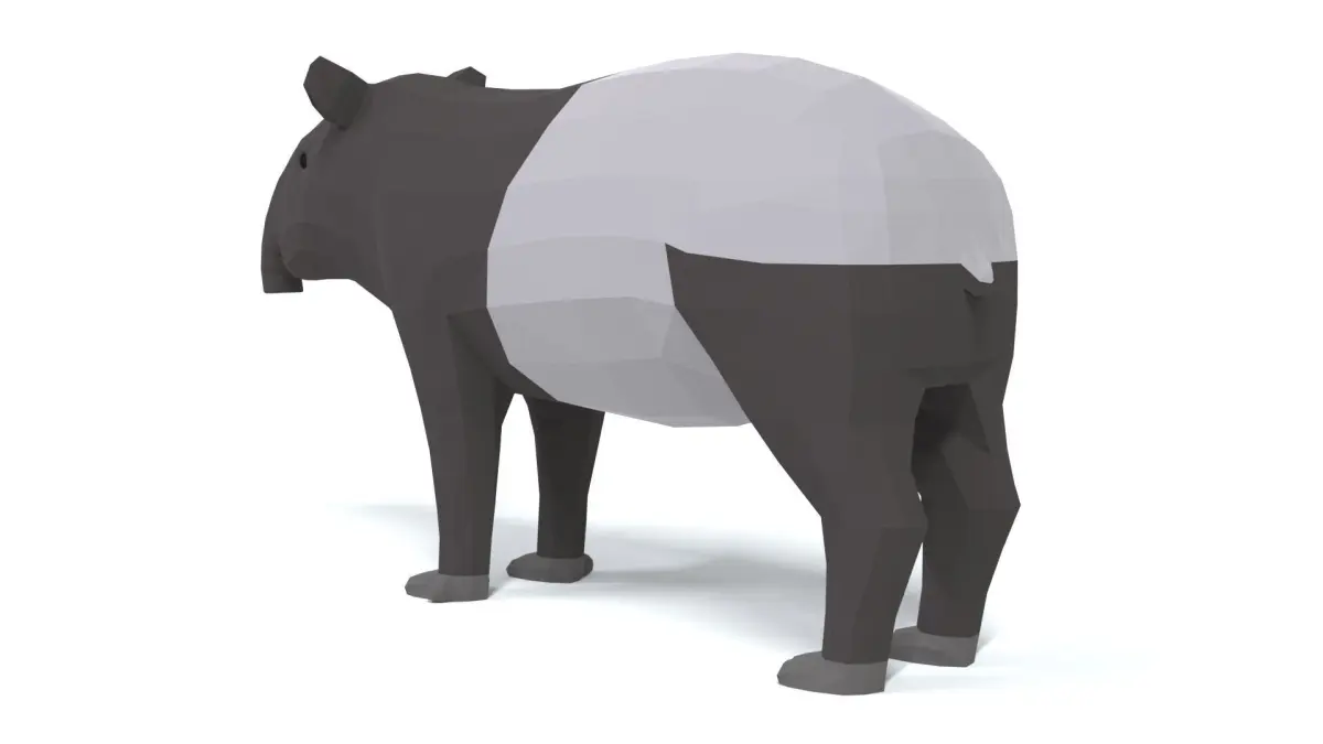 This is a low poly 3D model of a Tapir. The low poly tapir was modeled and prepared for low-poly style renderings, background, general CG visualization presented as 1 mesh with quads only.