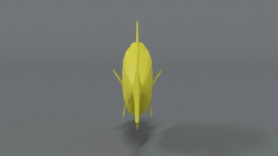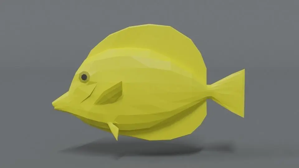This is a low poly 3D model of a yellow tang fish. The low poly fish was modeled and prepared for low-poly style renderings, background, general CG visualization presented as a mesh with quads/tris.