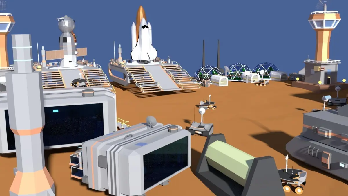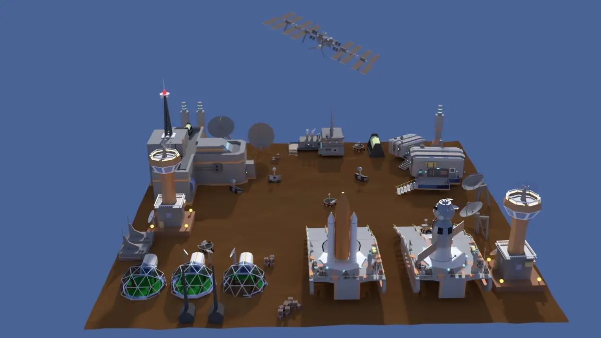 Low poly models of a fantasy space colony. Consists of spacecrafts(ISS, Soyuz etc), four types of buildings (one with an interior including a shelf, books, table, 2 kinds of chairs, monitors, bucket), smoke, two kinds of rovers, a spaceship platform, various boxes, towers, lights, ventilation shafts, chimneys, pipes, a greenhouse with trees inside the glass part, a terminal, satellites and radars.