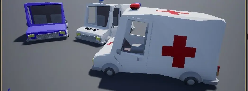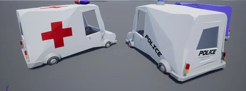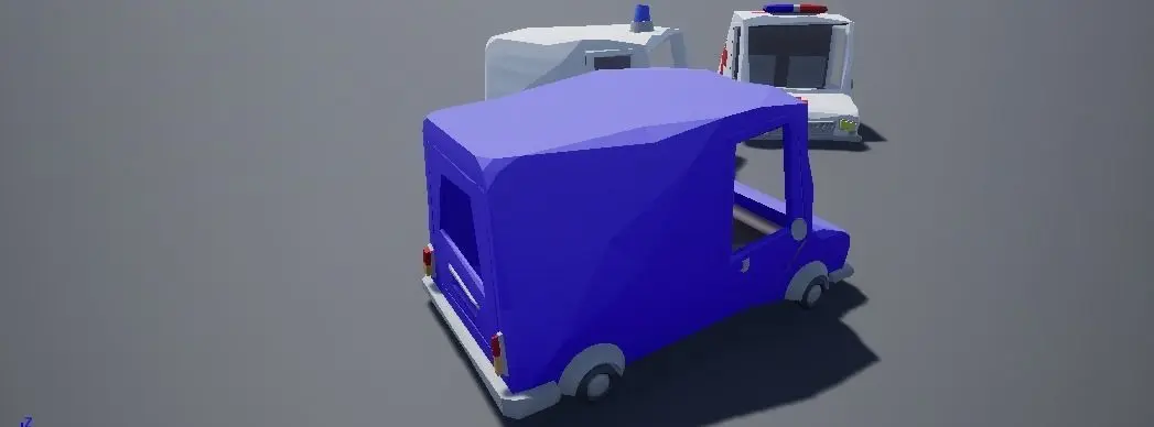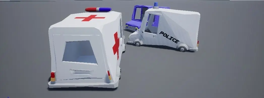 An assortment of 3 Vans, in a low-poly, highly stylized style.Contains-Police Van (2 Variants: All in one Static Model, and a Dynamic 'Kit' Containing Chassis and Pivotable Doors)-Ambulance (2 Variants: All in one Static Model, and a Dynamic 'Kit' Containing Chassis and Pivotable Doors)-Default Van (2 Variants: All in one Static Model, and a Dynamic 'Kit' Containing Chassis and Pivotable Doors)