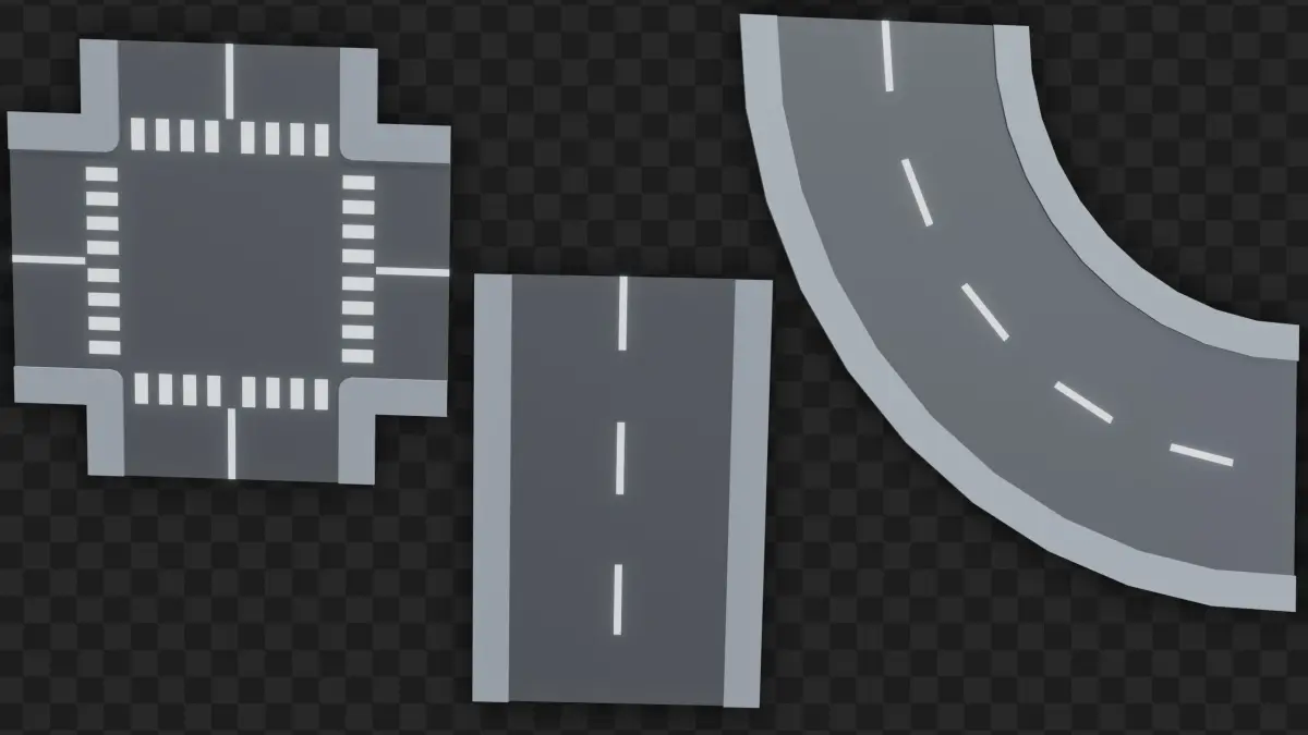 The asset pack comes with three road models. A straight road, a curved road, and an intersection. These road models were modeled at a specific size, so that you can turn on Blender’s snapping feature, and then duplicate and connect the road pieces, to create a low poly city.