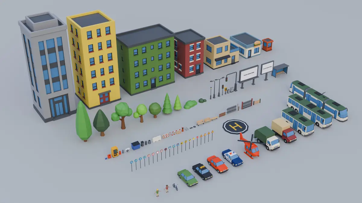 Build your own vibrant low poly city scene with this stylized asset pack, perfect for games, mobile apps, simulations, and prototyping. The pack includes 87 unique models, each provided in two distinct color versions, for maximum flexibility and style variation.