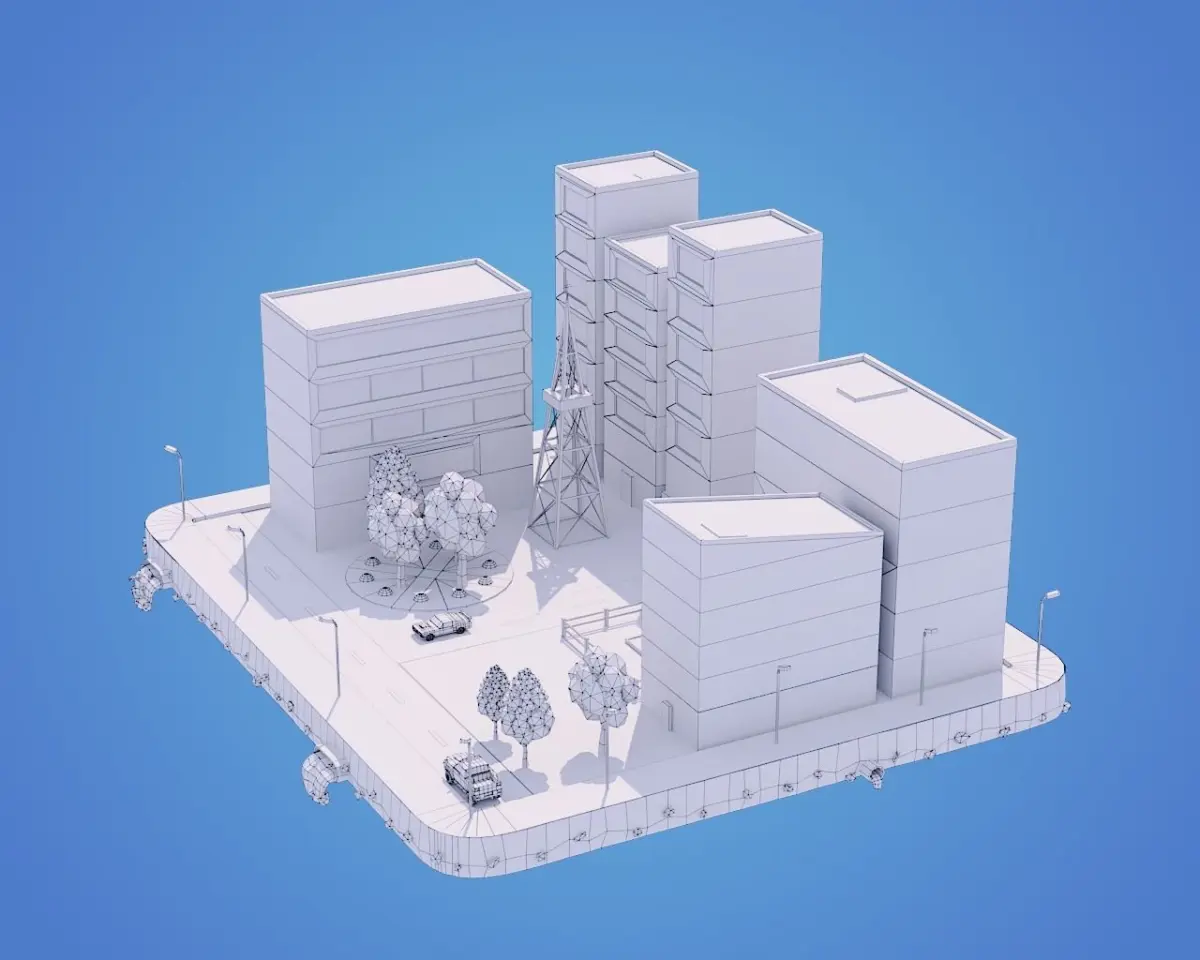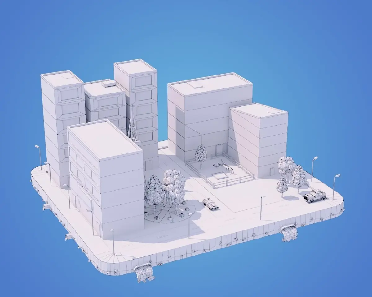 What Included In 3D Model ⦁Six Buildings⦁Two low-poly cars⦁Playground⦁Tress and bushes⦁Parts of exterior⦁Platform