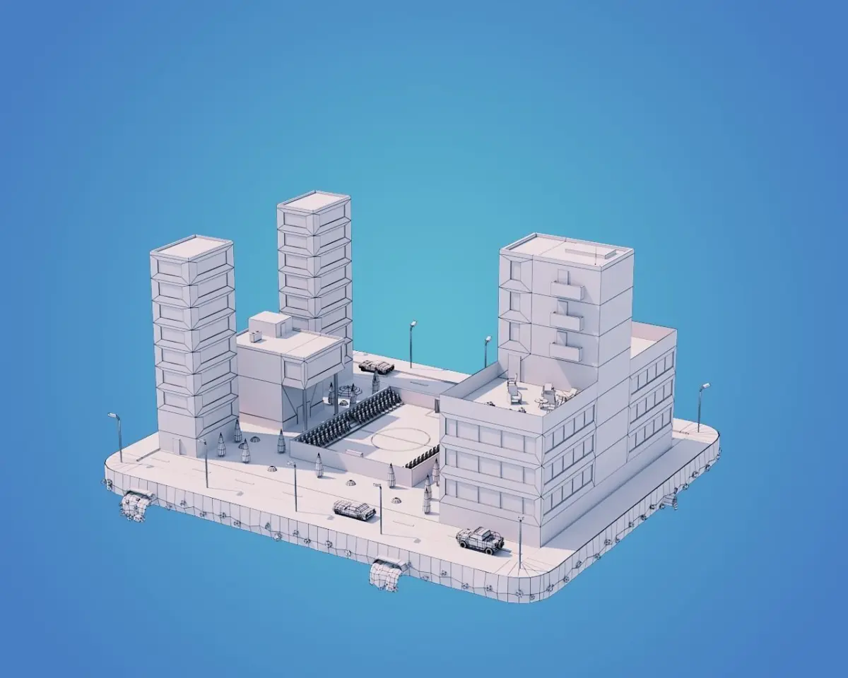 What Included In 3D Model ⦁Four Buildings⦁Three Low Poly Cars⦁Low Poly Soccer Stadium⦁Tress and bushes⦁Parts of exterior⦁Platform