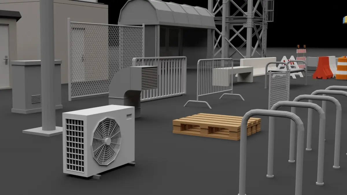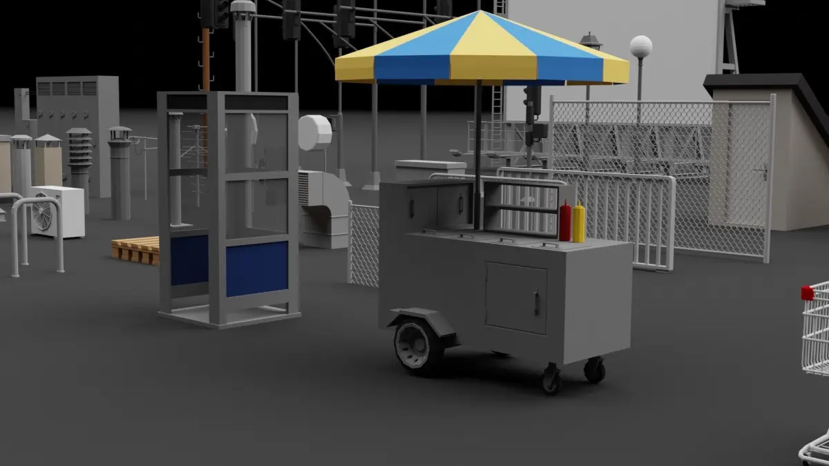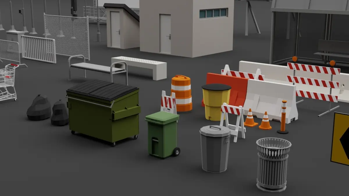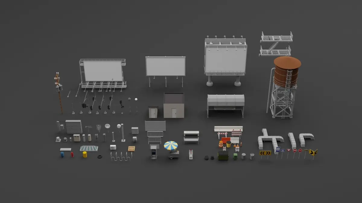 This asset includes :antena x4;banner x3;barrel x1;barrier x2;bench x2;bicycle parking x2;bus stop x1 ;chain link fence x2;Concrete barrier x1;conditioning x1;cone x2;fire escape ladder x1;hot dog cart x1;hydrant x1;Light Pole x4;mail box x1;phone booth x1;road barrier x8;roof access x2;roof elements x4;rubbish x2;shoping cart x1; sign post x8;tire x1;Traffic Light Pole x5;trash can x4;utility pole x1;ventilation x14;Water tower x1;Wooden pallets x1.