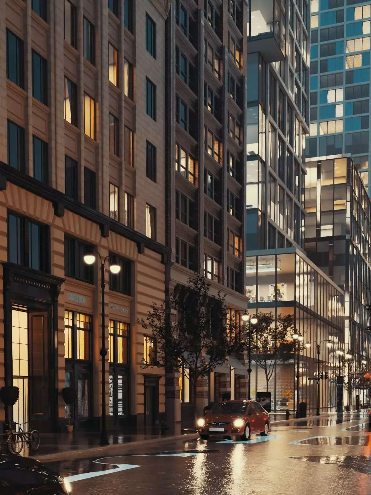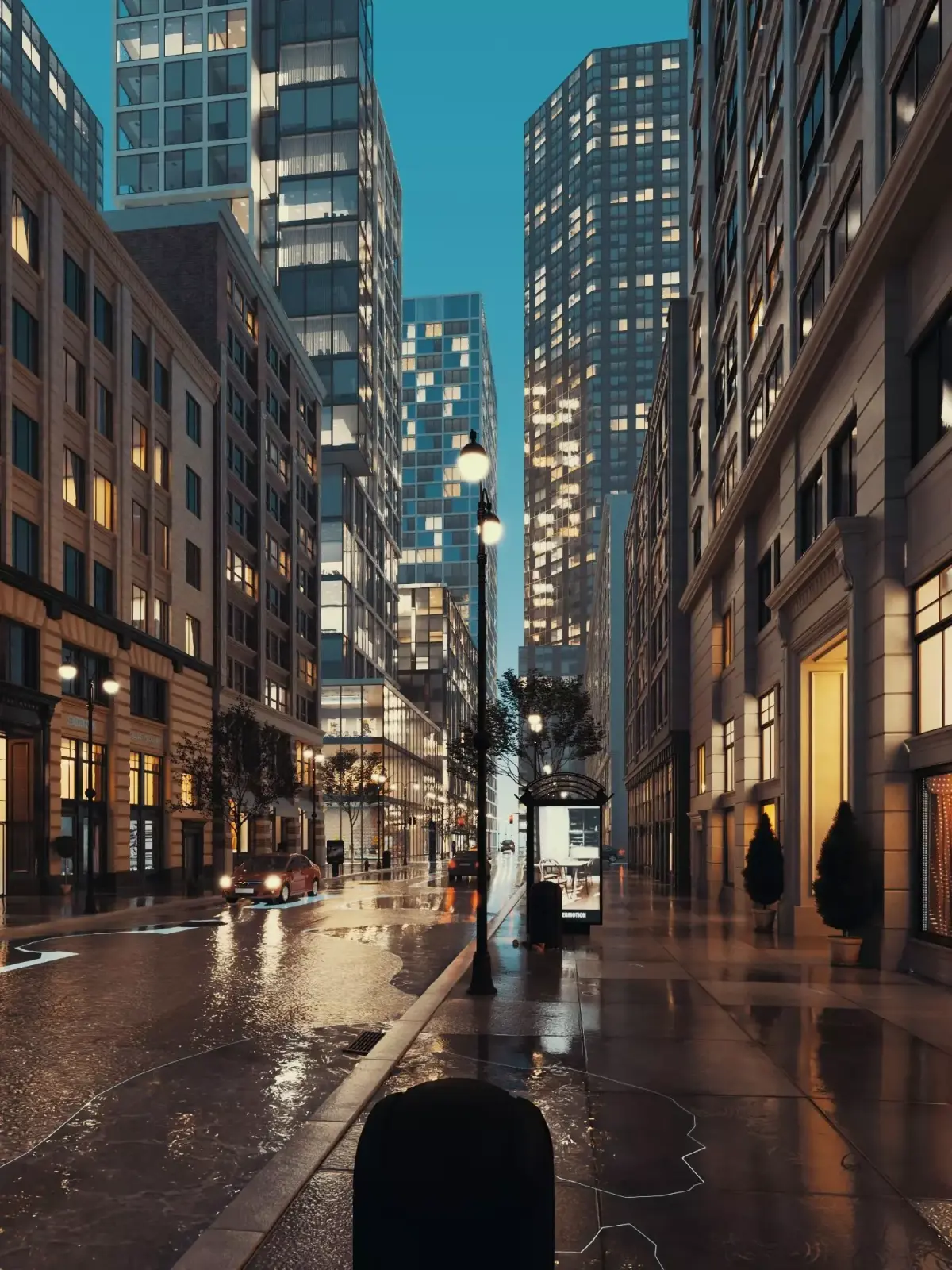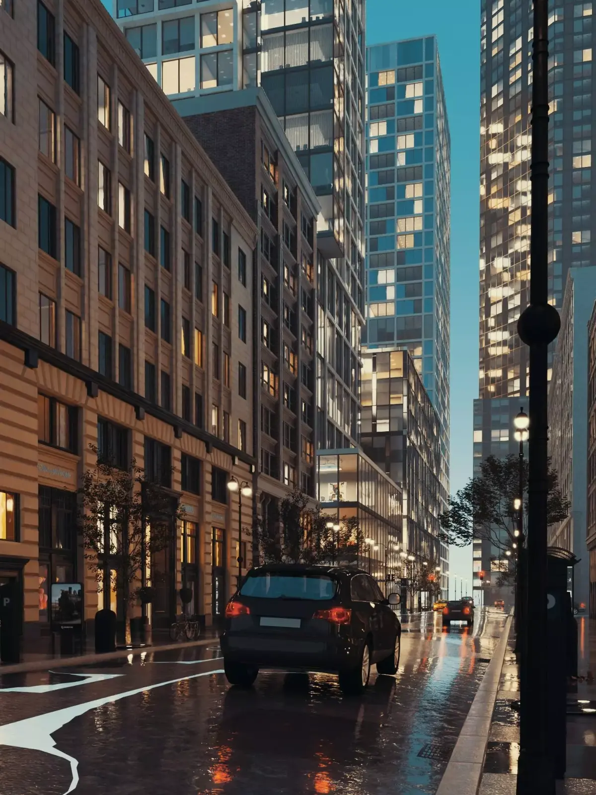 A highly detailed low-poly city street scene featuring modern high-rise buildings, classic brick structures, street lamps, parked cars, and wet reflective pavement. Perfect for game environments, architectural visualization, VR/AR projects, film backgrounds or real-time rendering.