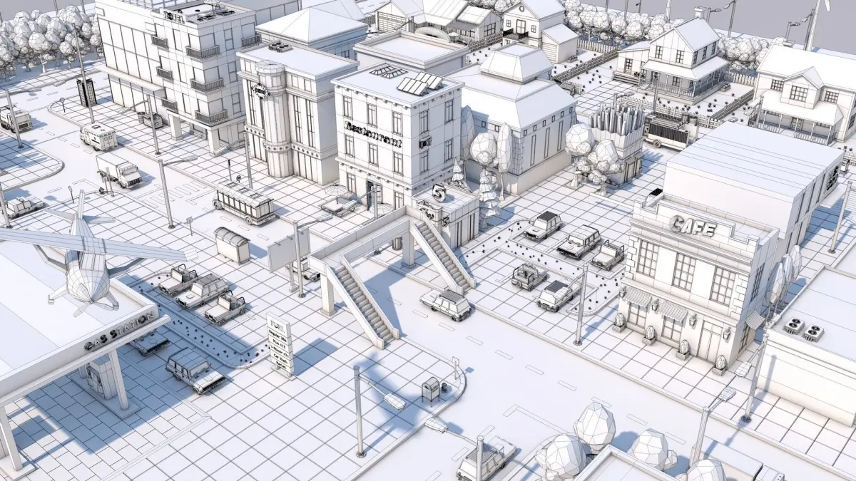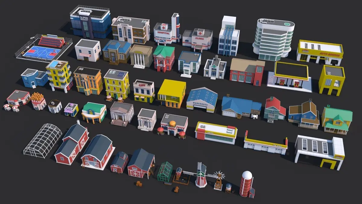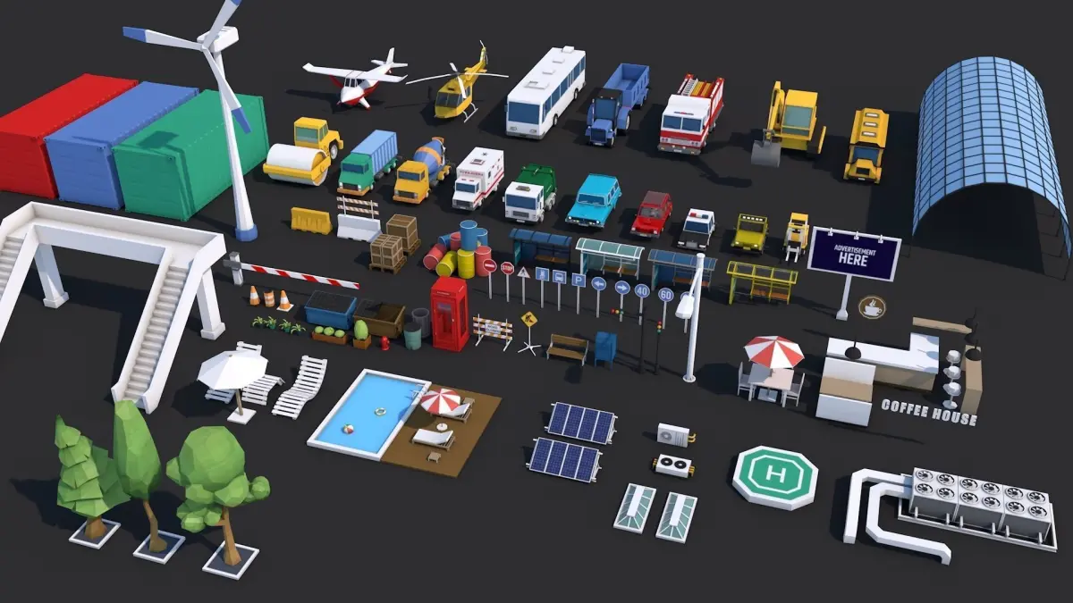 Contained in a Pack:Supermarket, School, Hospital, Clinic, Office, College, Auto Service, Basketball Court, Farm, Residental House, Bank, Theater, Church, Fire Station, Gas Station, Police, Hotel, Casino, Restaurant, Cafe, Fast Food, Warehouse, Sloped House, Cottage, Coffee House, Coke, Shop, Post Office, Museum, Burger, market, Car Wash, Showroom, Farm House, Trees, Rooftop, Sign, Traffic Light, Telephone booth, Solar Panel, AC, Ventilation, Containeer, Wind Turbine, Drum, Bus Stop, Swimming Pool, Plants, Flower, Helicopter, Bus, School Bus, Excavator, Crane, Ambulance, Garbage Truck, Car, Police Car, Jeep, Forklift and many more Street props