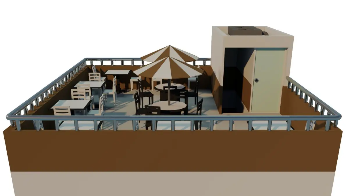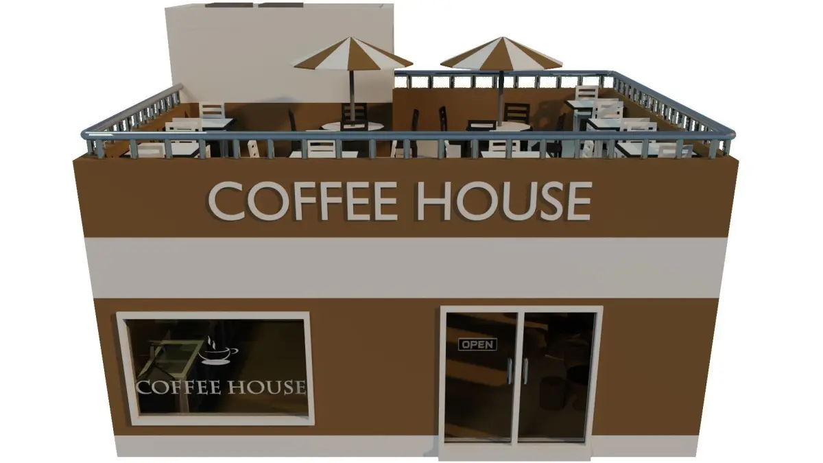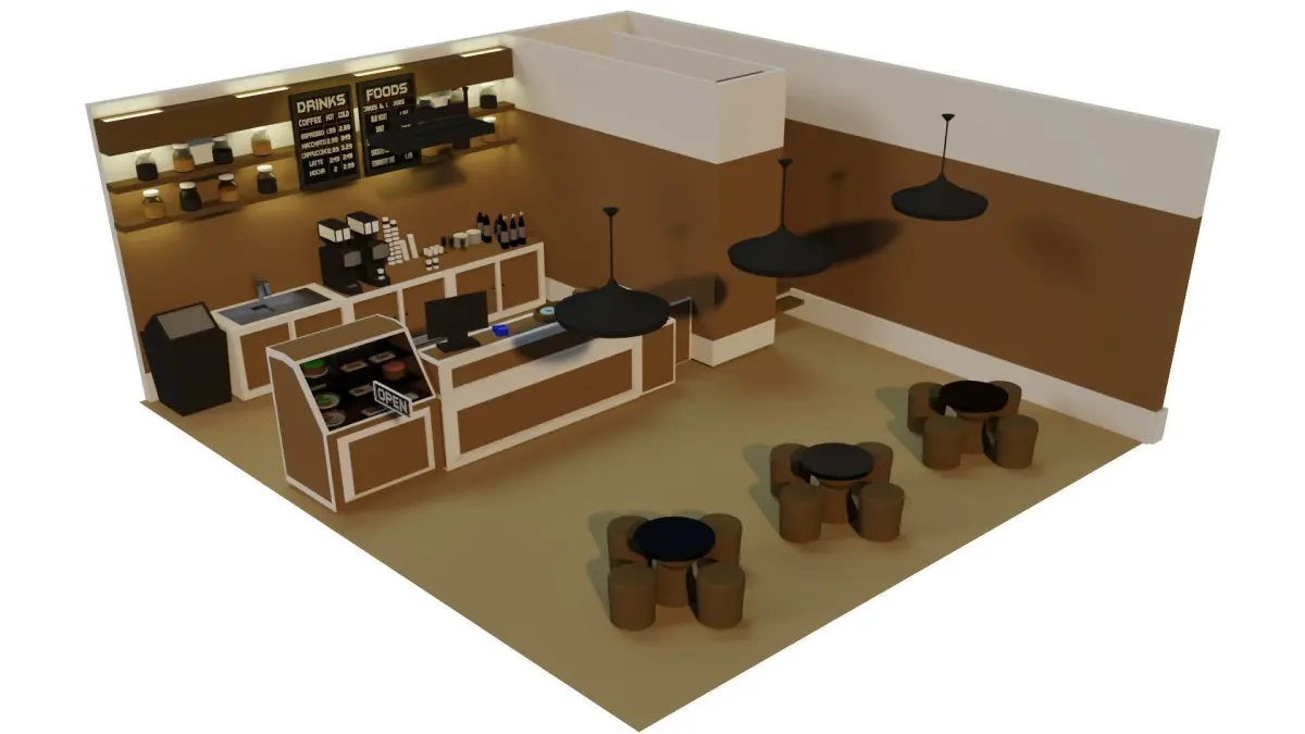 An low poly coffee house exterior with interior.