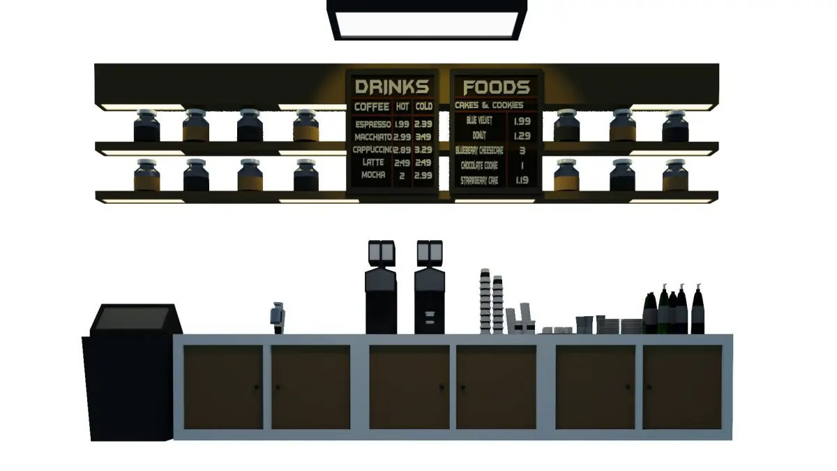 3 Coffe cup, coffee maker, trash can, signs, plate, monitor, cake & donut, 2 unique lamp, 2 unique chairs, 3 unique tables, bottles.