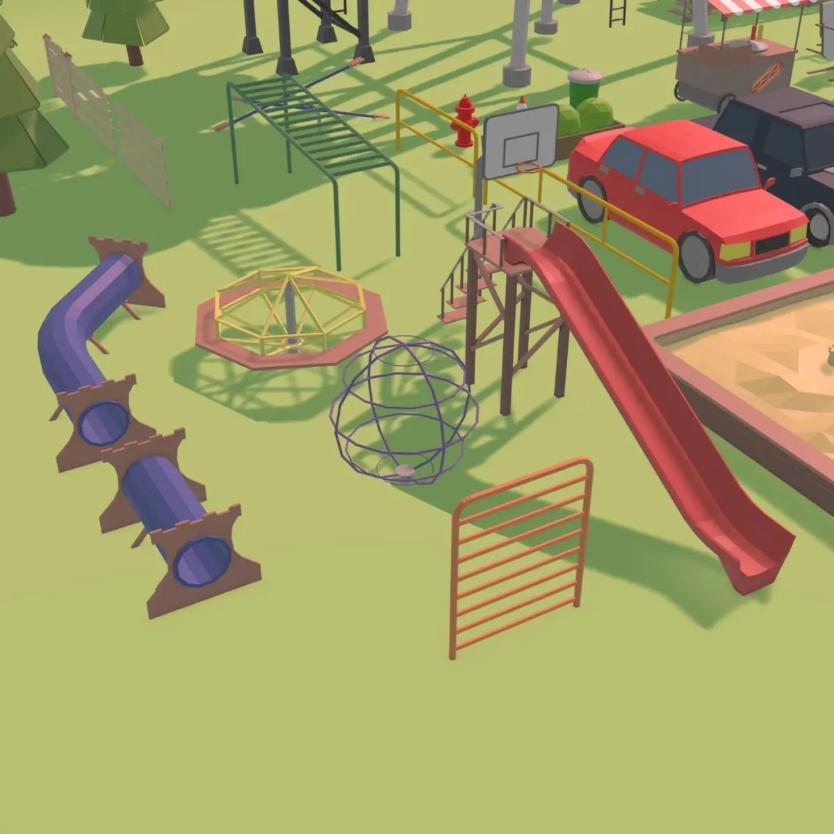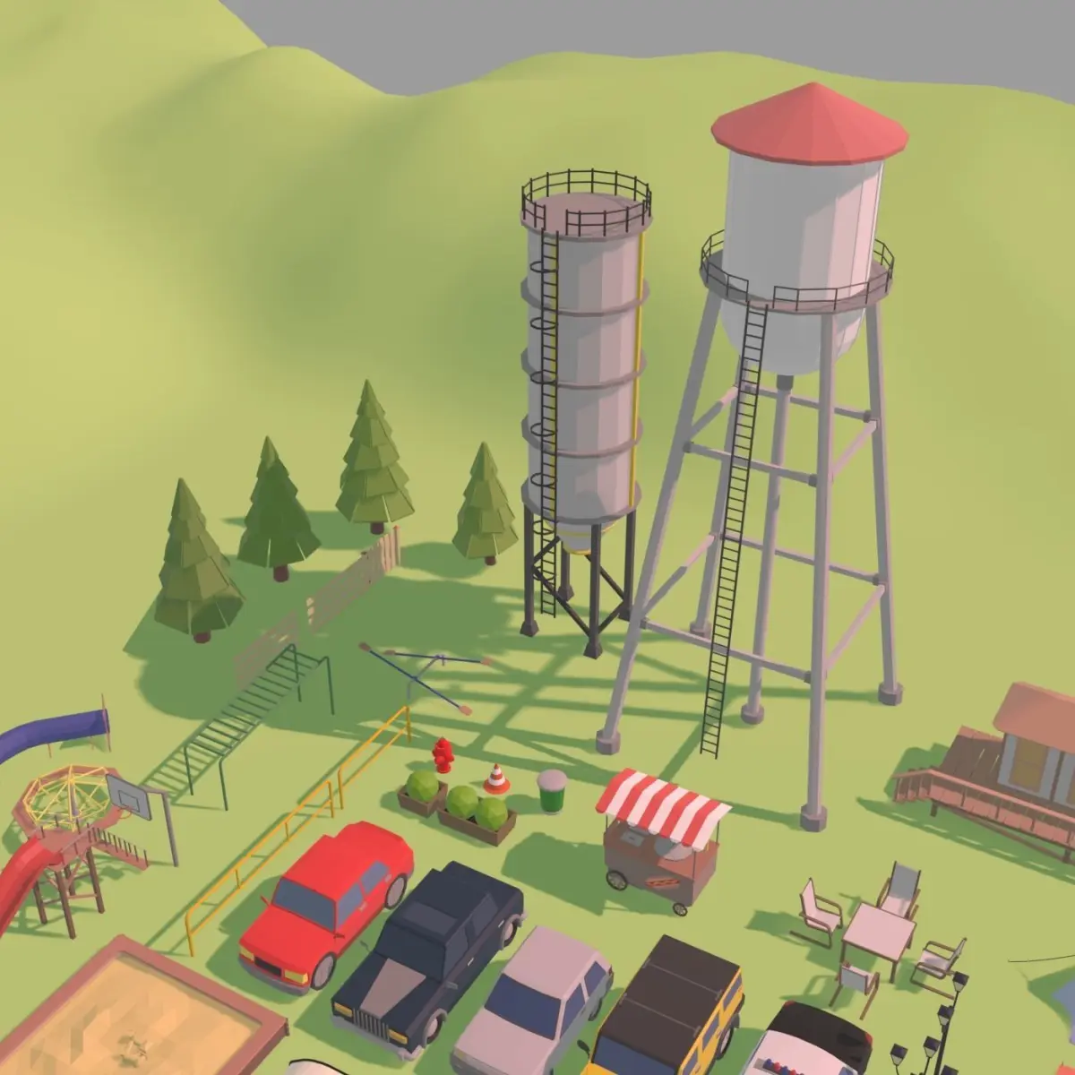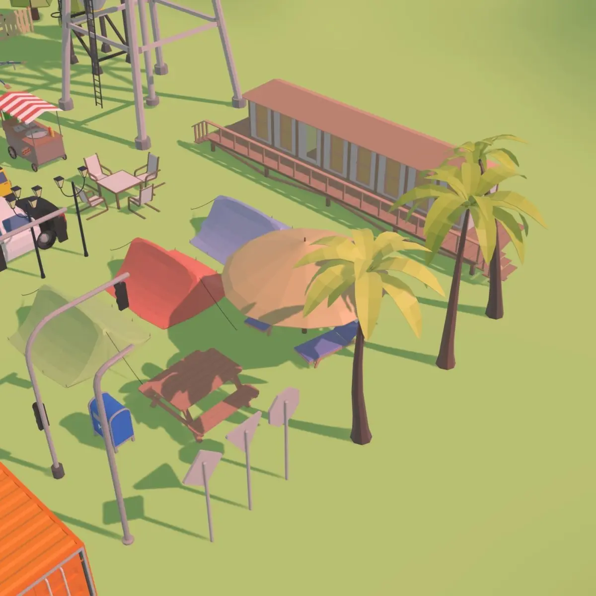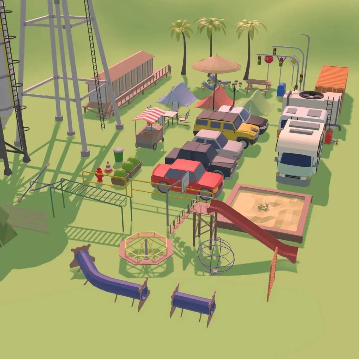 - 72 objects in the scene:Each object is unique, has its own simple texture and is intelligently named.There are cars, caravans, bunch of trees, children's jungle gym, fences, tents, dressing room, urban and beach assets and so on. Explore it yourself if you like.Every object is suitable for UNITY or other software.63 366 verts, 57 102 faces including terrain.