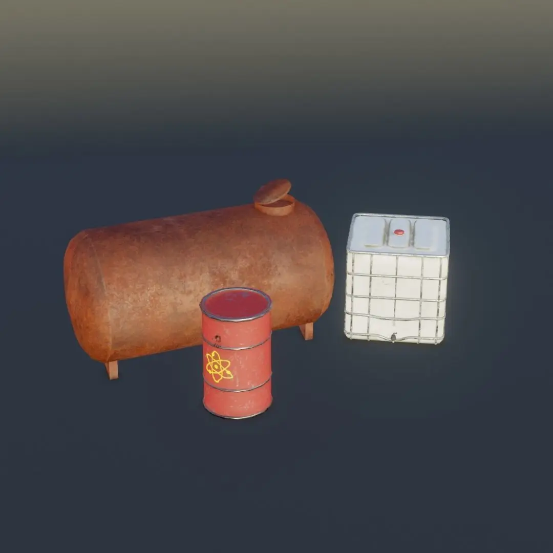High detailed 4k texture low poly red petrol barrel + rusty water tank + old lbc plastic water storage redy for gaming the texture embeded to the fbx files all the texture maps are includedcontact me for any lox poly asset