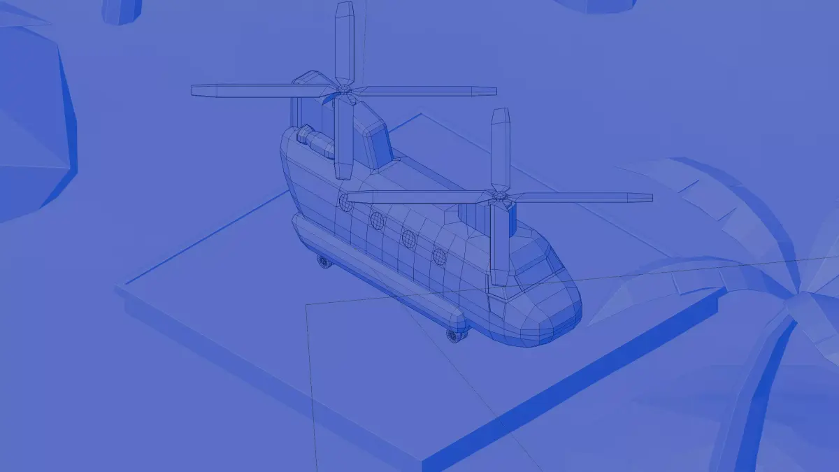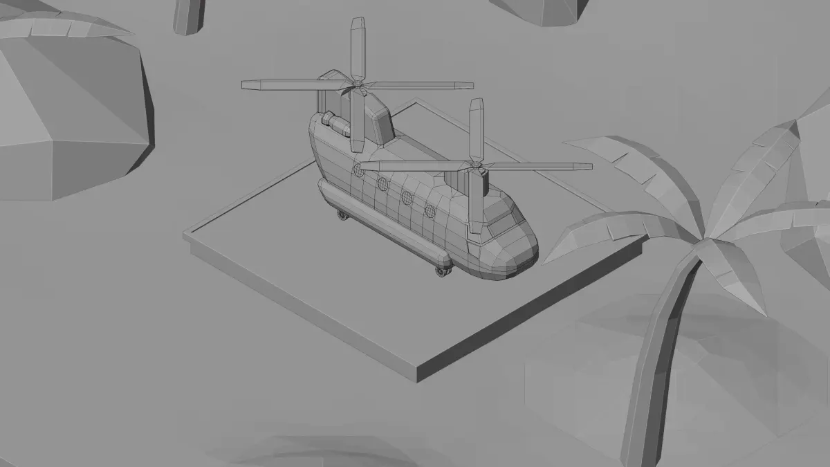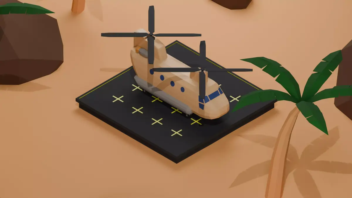 A stylized low poly 3D desert scene featuring a military helicopter (Chinook style) on a landing pad, with palm trees and rocks. Perfect for games, animation, or visualization projects. Optimized low poly geometry with clean topology.