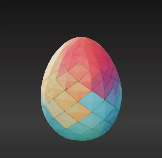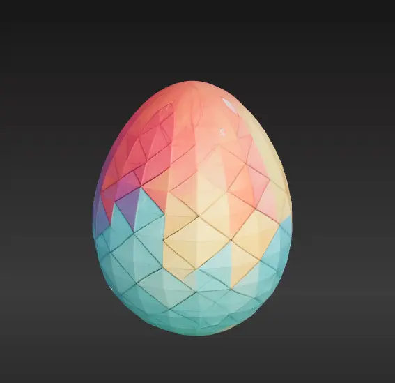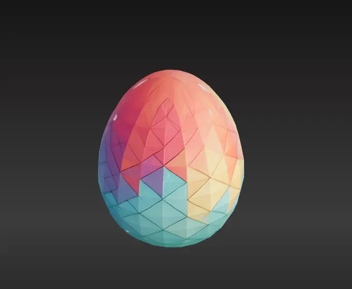 An Easter egg with a geometric pattern in a low-poly style. The design features vibrant pastel colors and a minimalist shape. Perfect for Easter decorations.