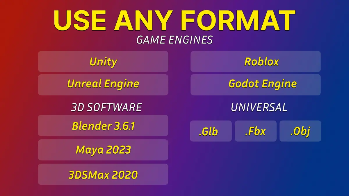 Exchange Formats: OBJ (OBJ, filesize: 16.4 MB), FBX (Autodesk FBX, filesize: 16.4 MB), MAX (Autodesk 3ds Max, filesize: 16.4 MB), MA (Autodesk Maya, filesize: 16.4 MB), GLTF (glTF, filesize: 16.4 MB), PNG (PNG, filesize: 16.4 MB)