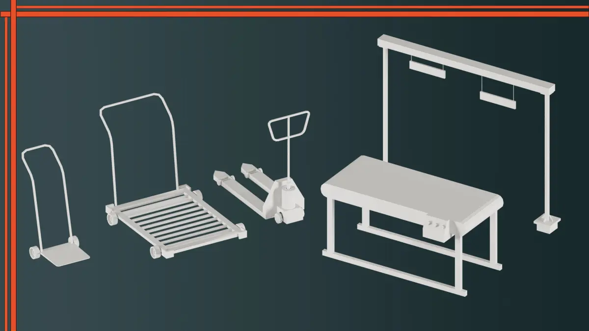A number of tools and equipment used in factories include lift trucks, types of boxes, separators, etc.