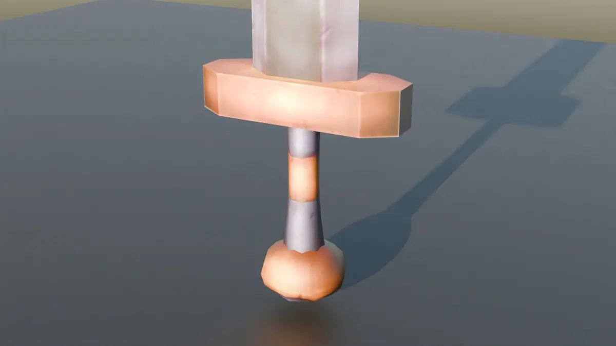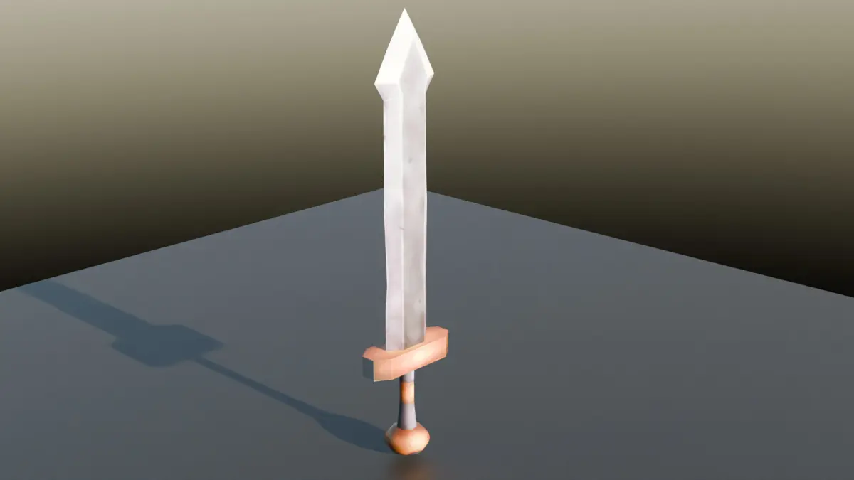 This is a low-poly sword model, designed for use in video games or other real-time applications. It is characterized by its simple geometry and low polygon count, which makes it efficient to render and reduces the strain on system resources. The sword features a stylized, cartoonish aesthetic with a focus on clear shapes and a limited color palette.