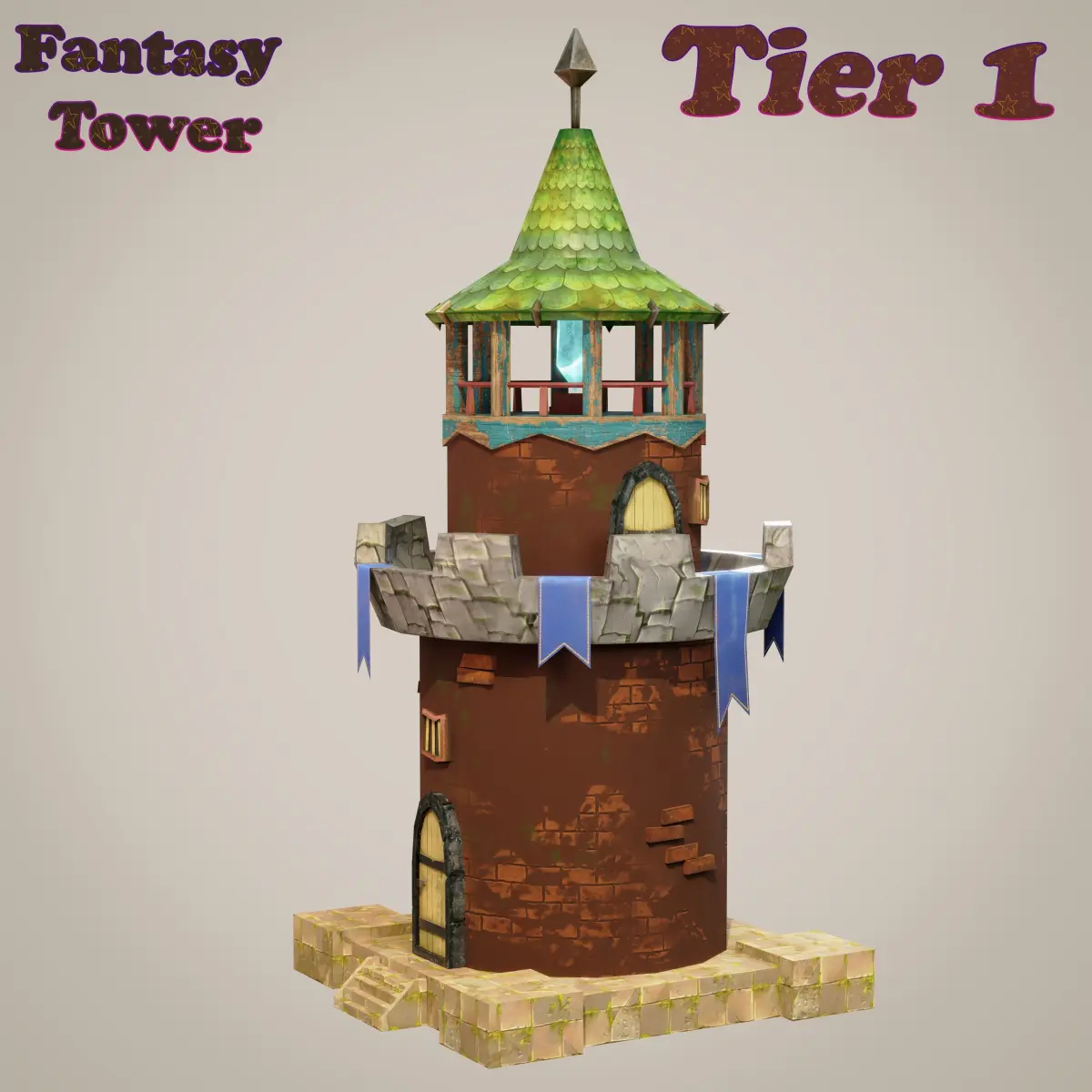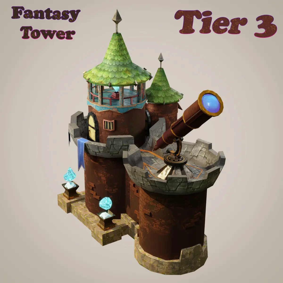 Low-poly optimized PBR game 3d-model of medieval / fantasy upgradable tower with 3 tiers.