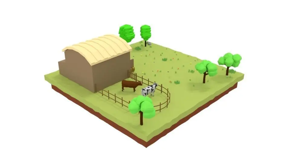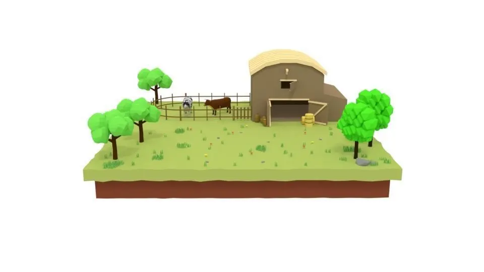 This is a low poly 3d barn scene. The low poly scene was modeled and prepared for low-poly style renderings, background, general CG visualization. Topology with quads and tris.