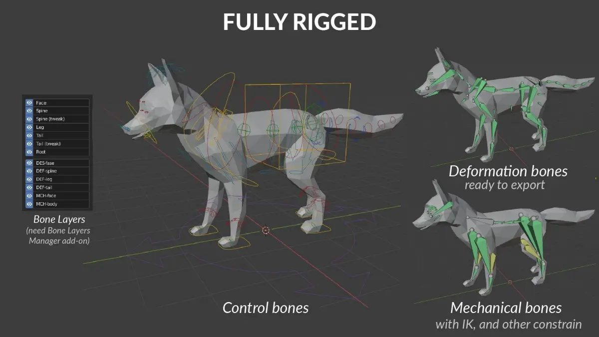 The model has 1244 vertexes, fully rigged, UV imitates colors