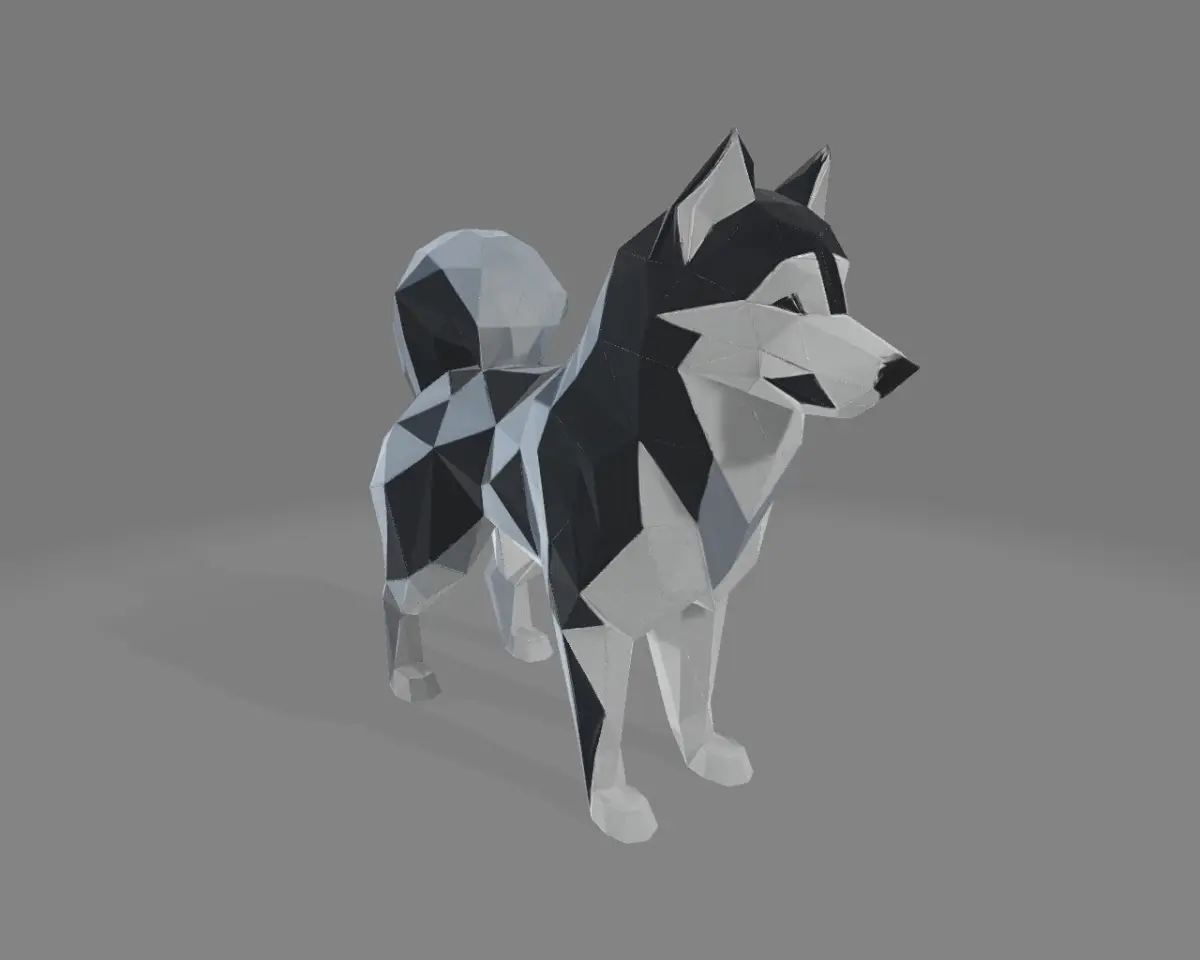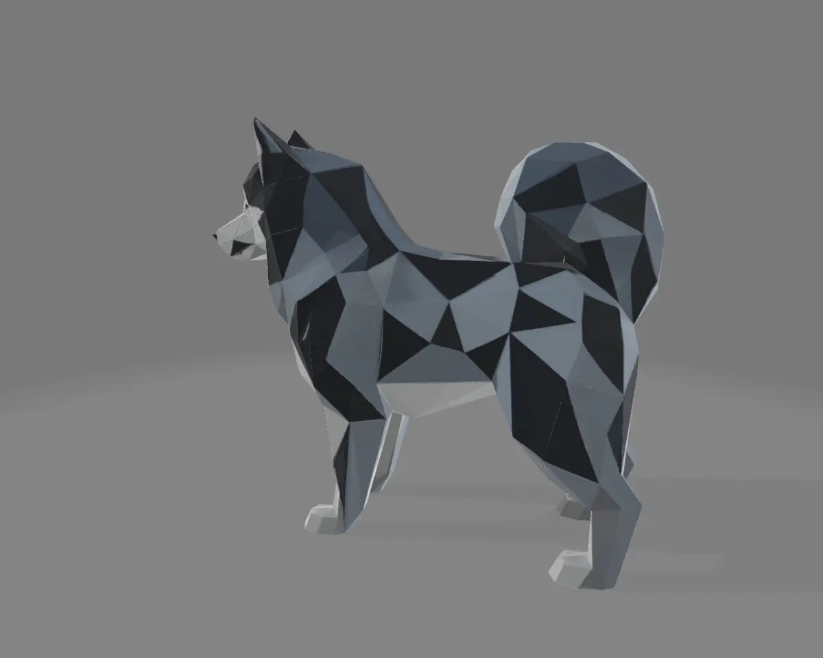 A modern 3D-printed sculpture of a husky dog, designed in a sharp low-poly style. Composed of angular triangles that evoke a faceted, origami-inspired look. The husky stands in a neutral pose with distinct ears, curled tail, and a stylized black and white fur pattern. Perfect for lovers of minimalist decor, polygonal aesthetics, and canine art.