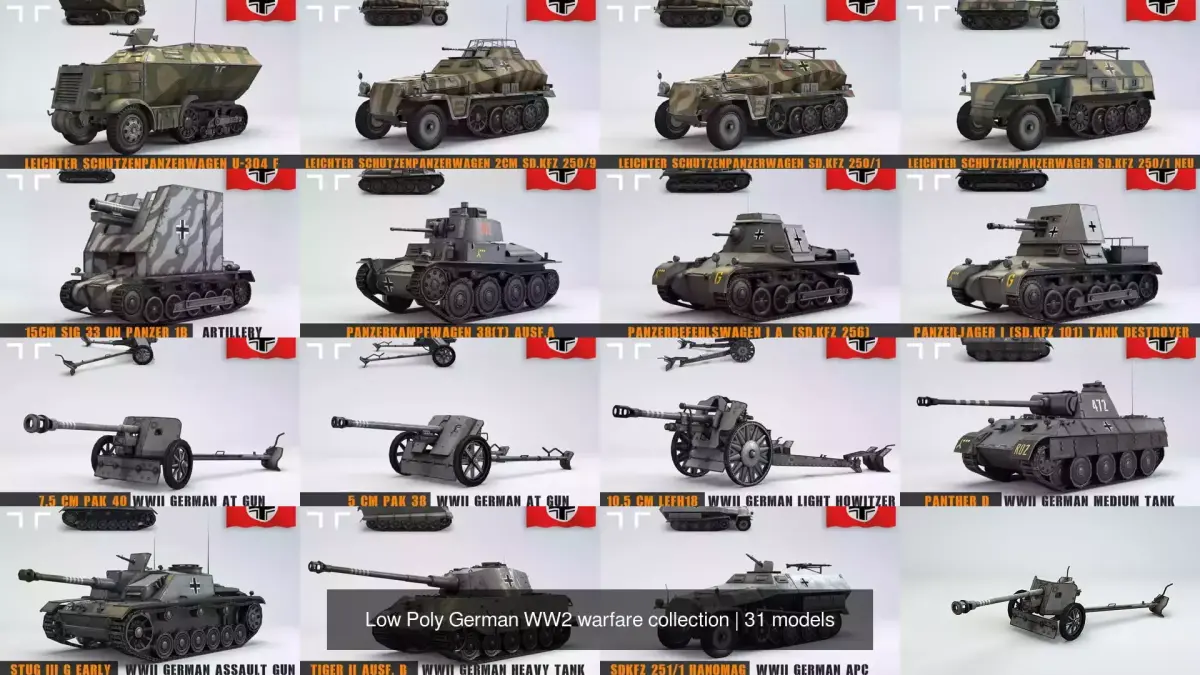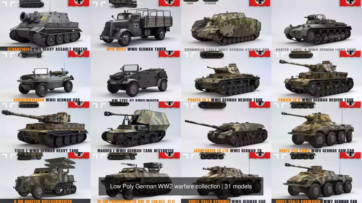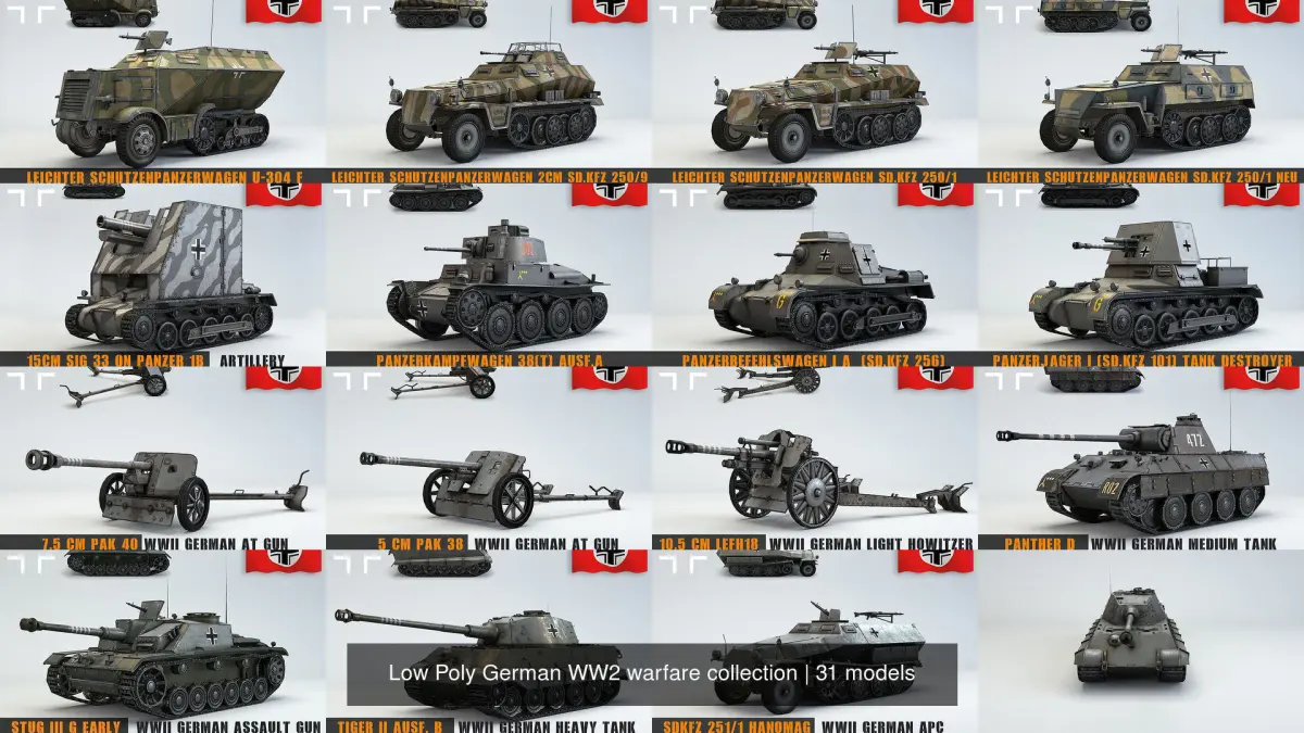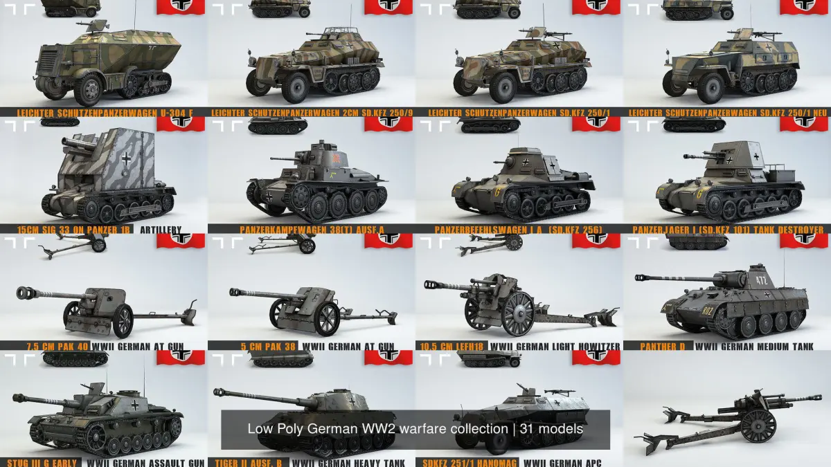 Included :Low Poly U 304 F Leichter SchutzenPanzerWagenLow Poly Sdkfz 251 Hanomag armored carLow Poly Tiger II Ausf G heavy tankLow Poly Sturmtiger ww2 german heavy assault mortarLow Poly Opel Blitz TruckLow poly SdKfz 166 Sturmpanzer Brummbar EarlyLow Poly Panzer I B Light TankLow Poly VW Type 166 SchwimmwagenLow Poly VW Type 82 KubelwagenLow Poly Panzer III E medium tankLow Poly Panzer IV G medium tankLow Poly Tiger Ausf E heavy tankLow Poly Marder I tank destroyerLow Poly Jagdpanzer IV L70 tank destroyerLow Poly SdKfz 234 2 Puma Armored CarLow Poly 8 cm Raketen Vielfachwerfer auf Fahrgestell Zgkw S303 fLow Poly 15 cm Panzerwerfer 42 MaultierLow Poly SdKfz 234 3 Stummel Armored CarLow Poly SdKfz 234 4 PakwagenLow Poly SdKfz 250 9 2cm Leichter SchutzenpanzerwagenLow Poly Schutzenpanzerwagen SdKfz 250 1Low Poly Schutzenpanzerwagen SdKfz 250 1 NeuLow Poly 15 cm sIG 33 Sf on PzIBLow Poly Panzer 38t Light TankLow Poly SdKfz 265 Panzerbefehlswagen I A LateLow Poly SdKfz 101 PanzerJager I Tank DestroyerLow Poly 7 5 cm Panzerabwehrkanone 40 Anti Tank GunLow Poly 5 cm Panzerabwehrkanone 38 Anti Tank GunLow Poly 10 5 cm leichte Feldhaubitze Anti Tank GunLow Poly Panzer V Panther D medium tankLow Poly Stug III Ausf G Early assault gun