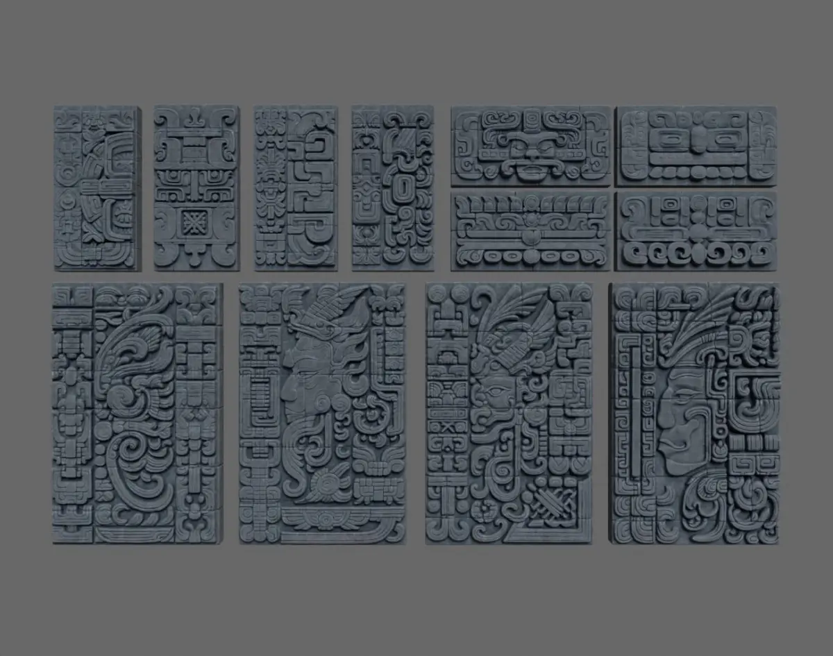 This product consists of 12 3D models of Mayan Temple Walls. These models are decorated with patterns and characters, following the ancient Mayan style. You can use them to enhance the liveliness of your project.