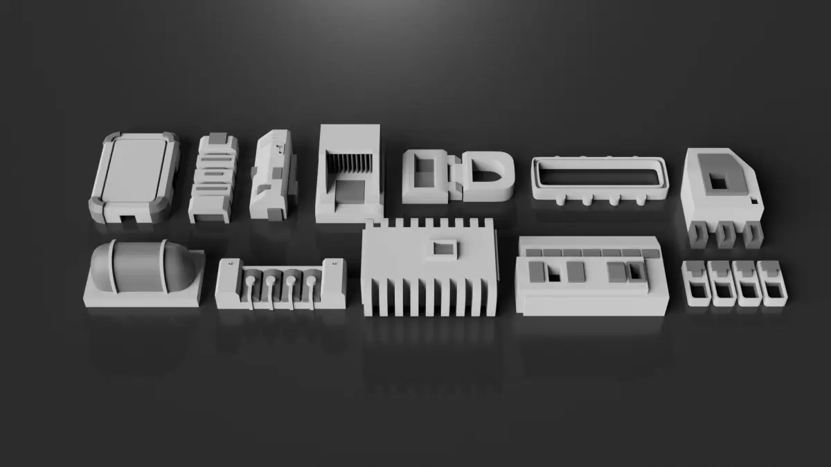 Over 50 greeble objects for use in kitbashing. Add easy details to spaceships, sci-fi buildings, vehicles, machines, robots, or whatever else you feel like.
