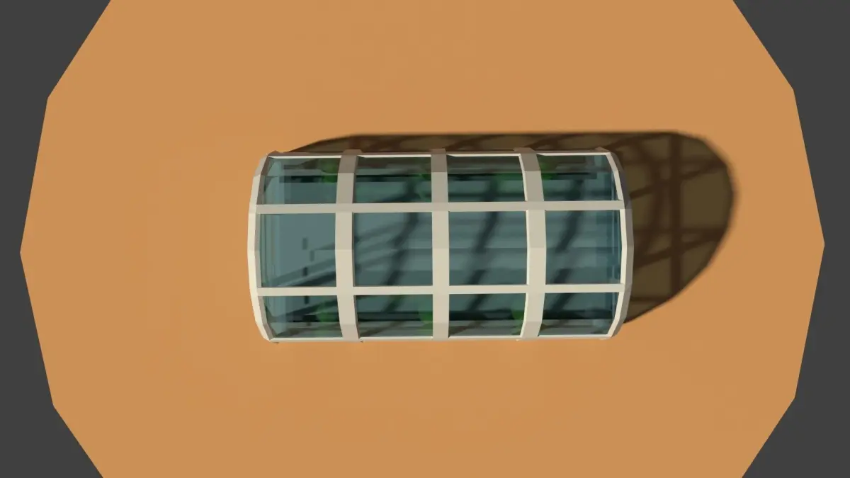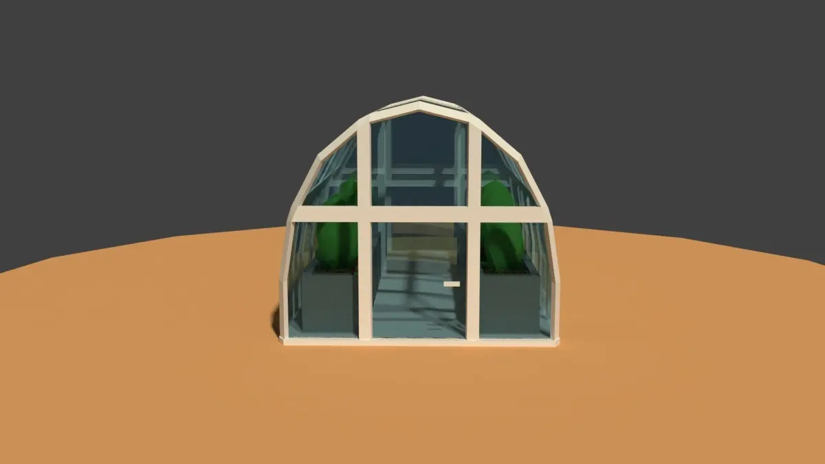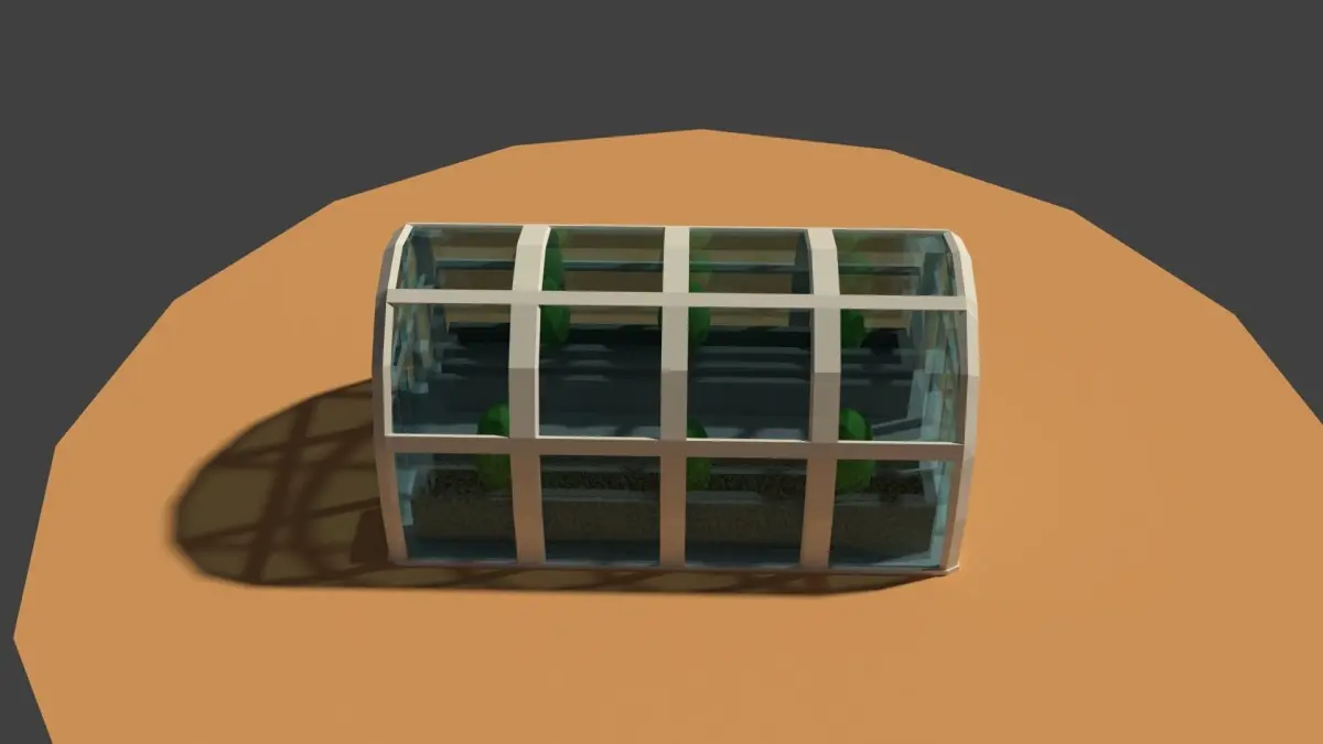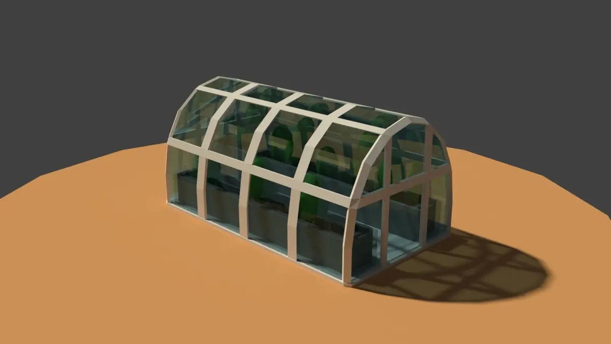A modern new greenhouse model modeled in a cartoony low poly style. Has some plants inside the structure.