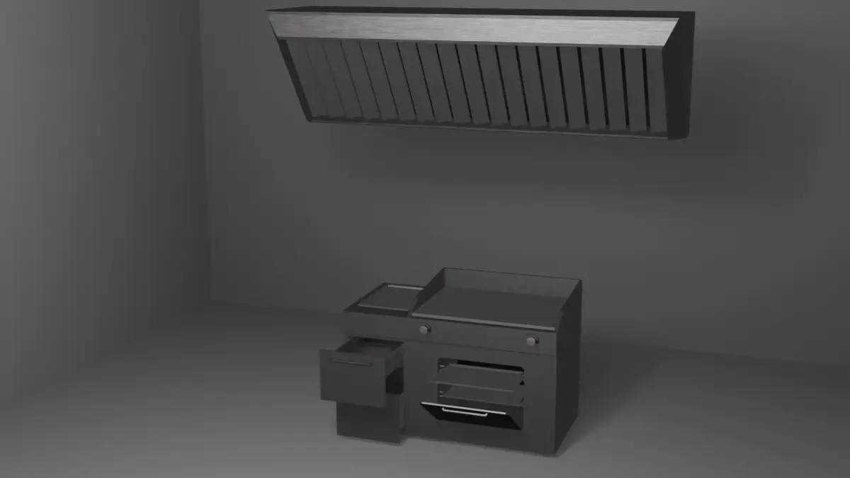 The model features an opening oven door with two rows of tray holders and baking trays inside. It also includes two functional drawers with handles, control knob elements, and a kitchen hood above the grill.