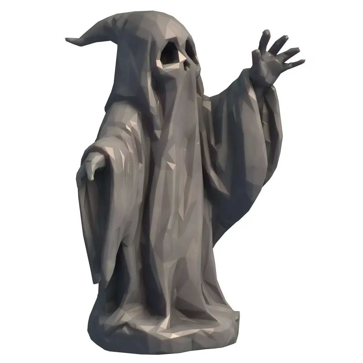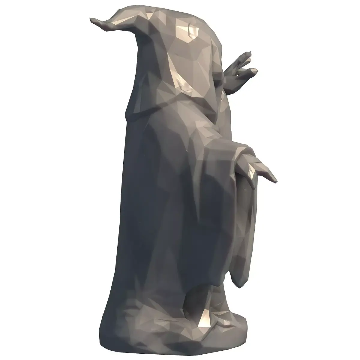 Minimalist low poly ghost figure featuring angular geometric design and clean faceted lines. This abstract Halloween decoration uses polygonal modeling to create a modern interpretation of classic ghost imagery. Perfect for tabletop displays, game assets, or contemporary holiday decor. Optimized for easy 3D printing with fast production time and minimal support requirements.