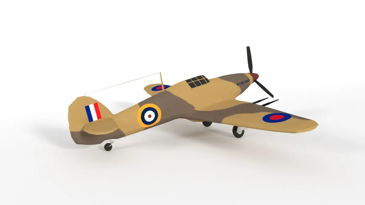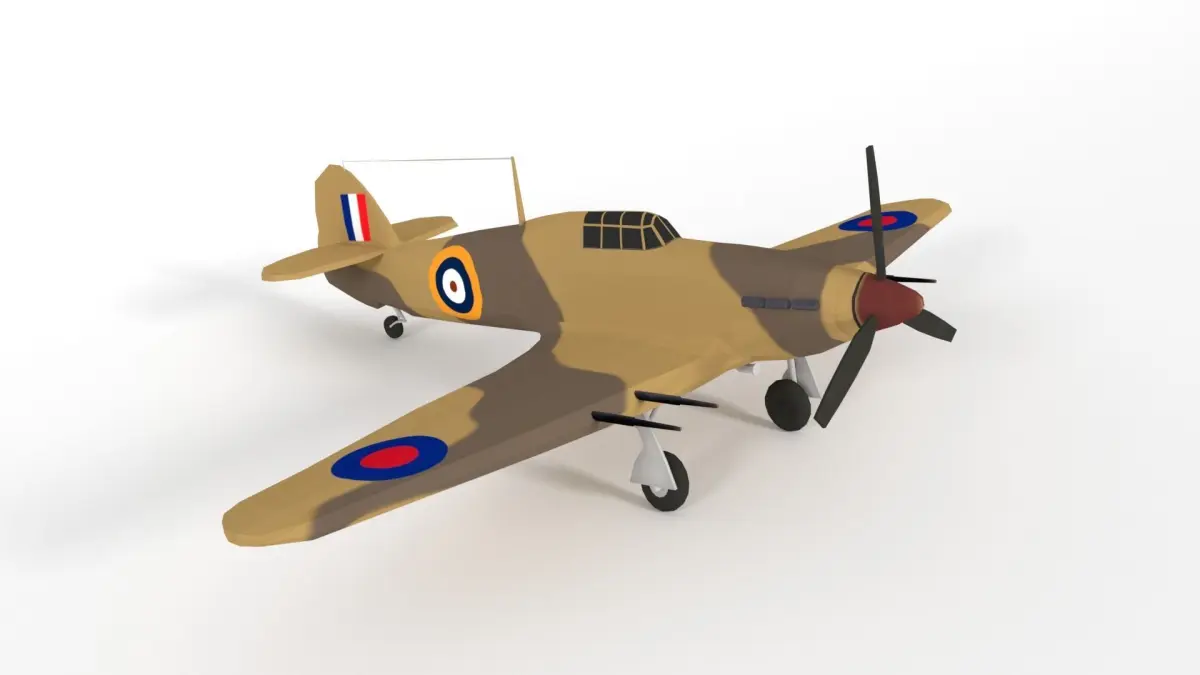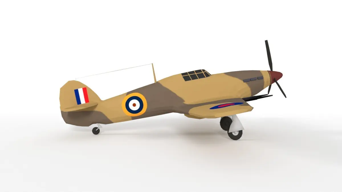 This is a low poly 3d model of a Hawker Hurricane MK IIC Airplane. The low poly Hawker Hurricane MK IIC Airplane was modeled and prepared for low-poly style renderings, background, general CG visualization.