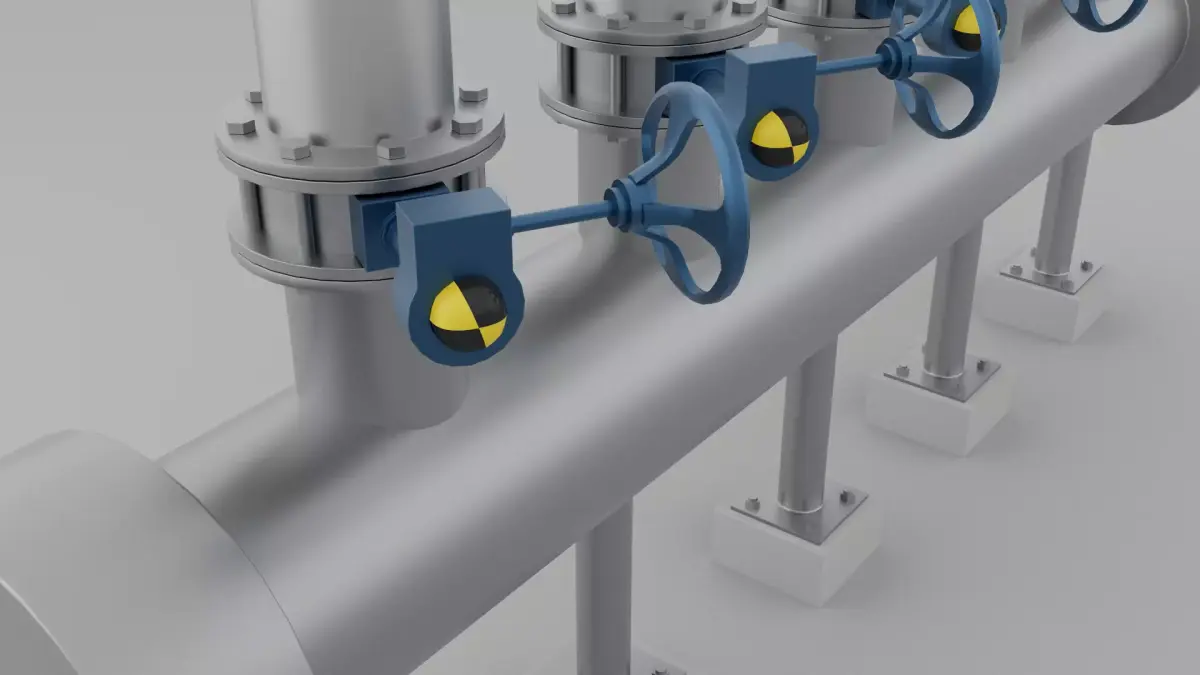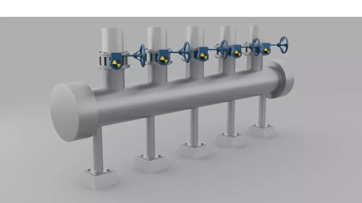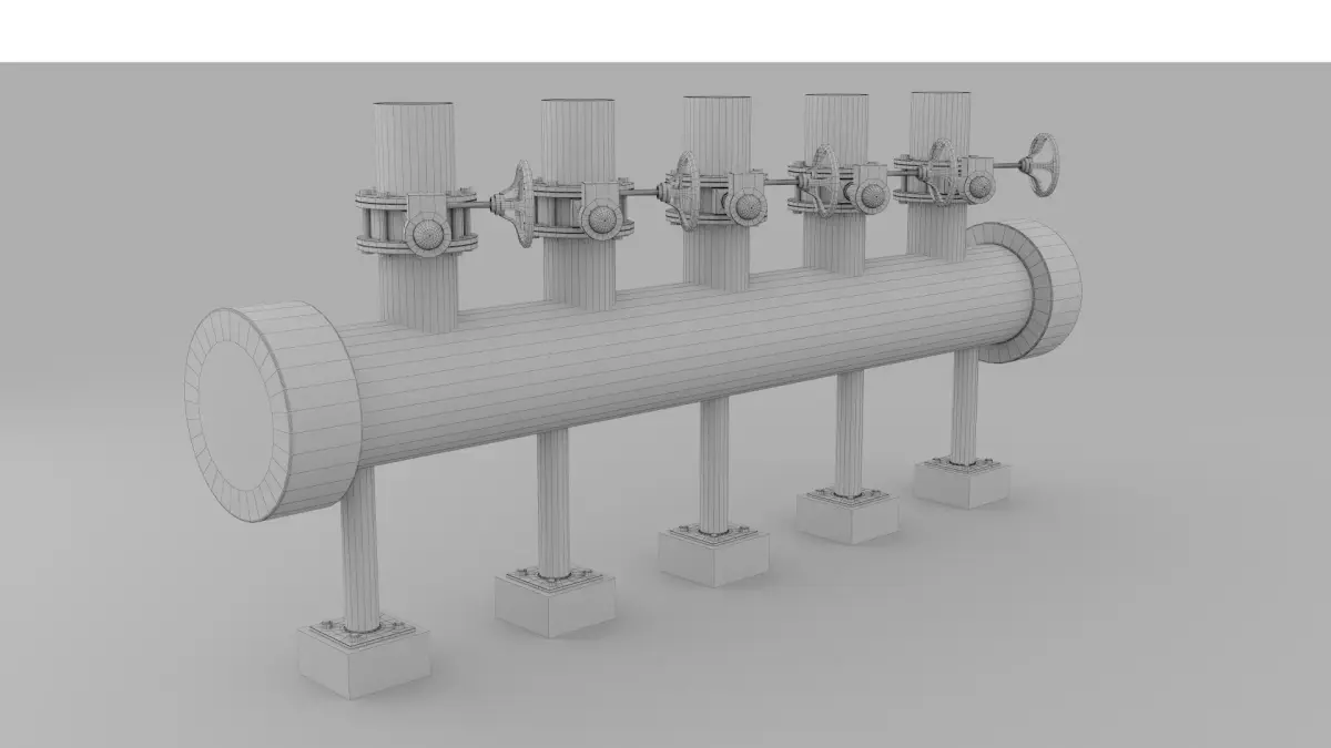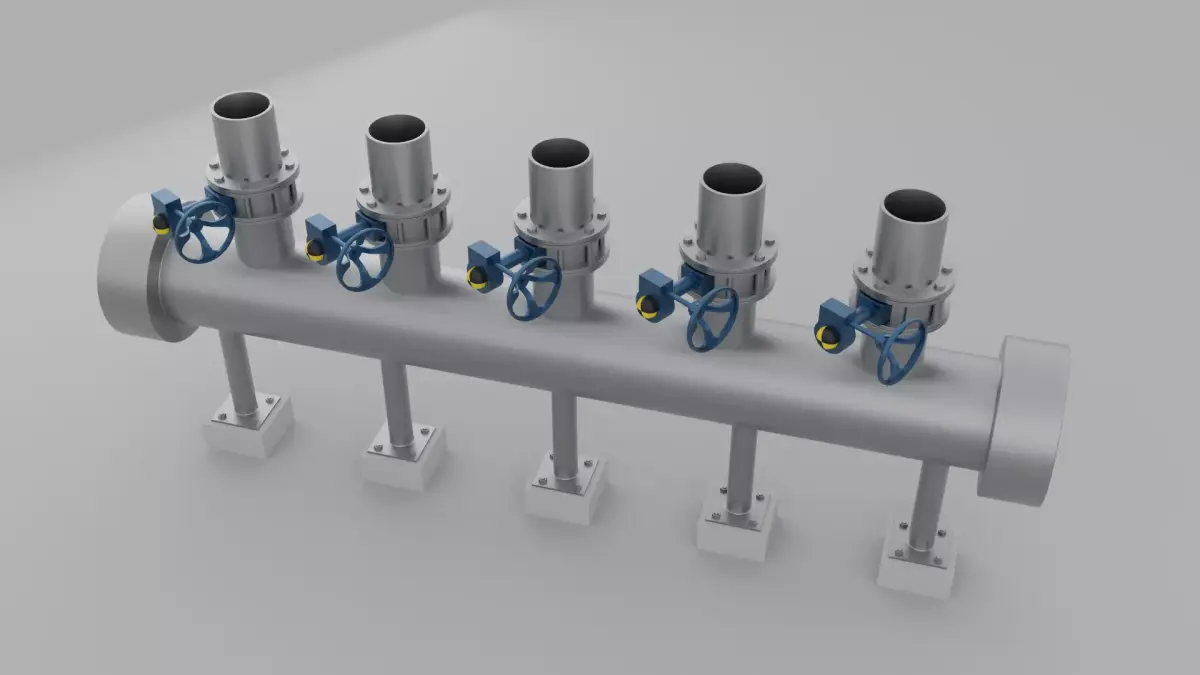 Pipe header assembly used in chilled water and heating water distribution systems to supply and collect fluid flow to multiple branch lines.This model represents a typical mechanical room header configuration with multiple outlet connections and valve assemblies.It is not modeled to real-world engineering specifications and is intended for visual and conceptual use only.