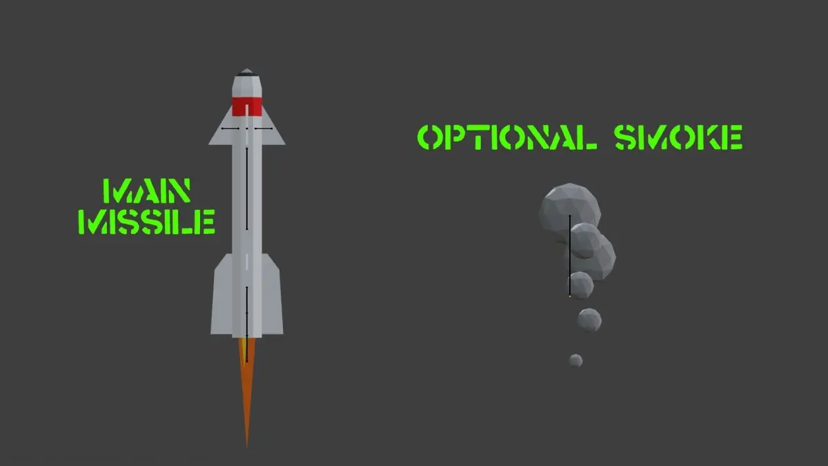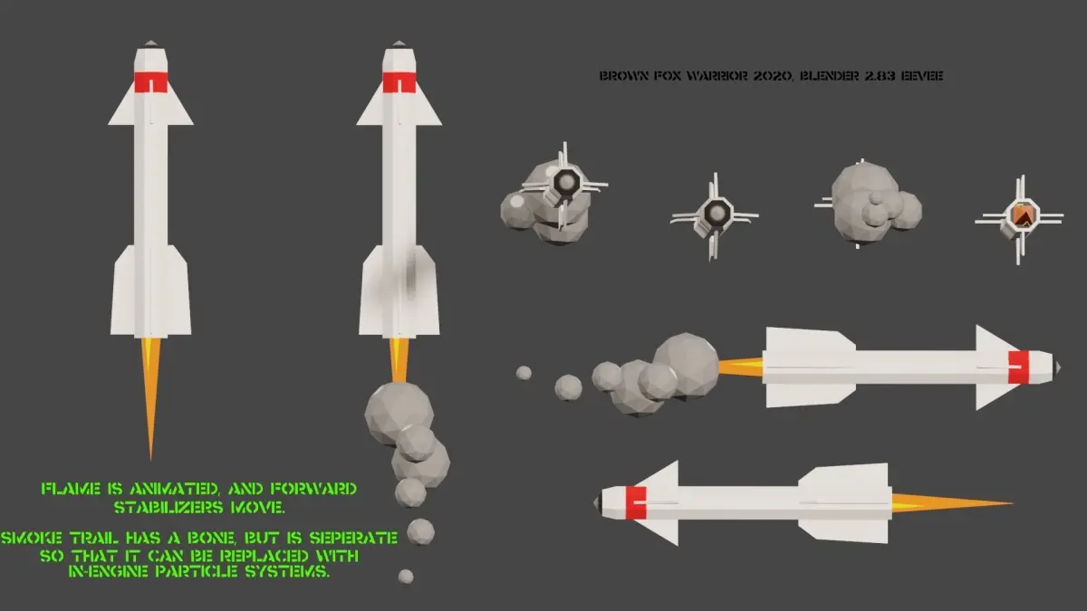 Missile is rigged, with all forward stabilizers/fins beingmoveable. The smoke cloud included isn't animated, but is seperate from the rest of the missile for easy removal.Overall, the whole thing is 668 faces 381 verts. The smoke is responsible for 480 of the faces and 252 verts. The missile is 188 faces and 129 verts.