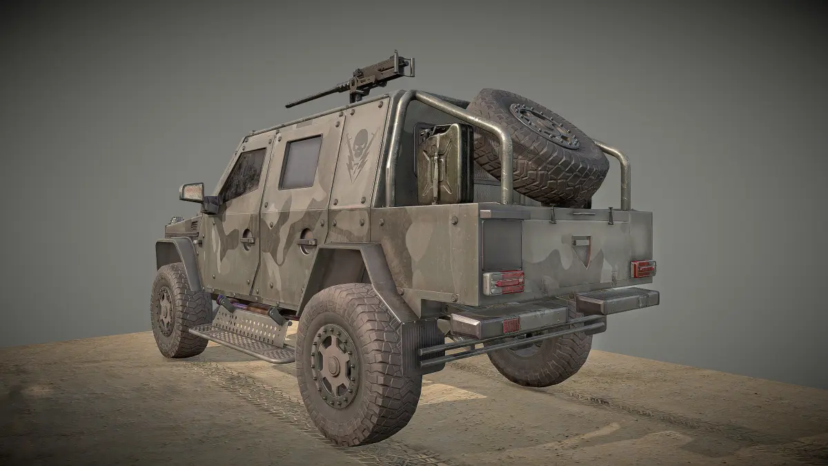 High detailed Low poly modified version from mercedes g500 with 39.708 polys ready to use in any project. The asset is centered in 0,0,0 coordinates and in real size. Doesn't need any additional plugins. This pack contains: 1 3ds max 2018 model, 1 3ds max 2015 model, 1 fbx model, 1 obj model and a rar file with the textures ready to create any shader. The model have been created with quads and it is unwrapped with non-overlapping uvs. The textures are PBR maps and specular - glossiness maps in 8192 x 8192 among them: base color, glossiness, Specular, diffuse, metallic, normal map, roughness, metallic, ambient occlusion and opacity. No materials are included since it depends on the final render engine and have to be created afterwards. The images of example are created with a PBR render. In addition to this, it is added a base with its textures in 2048 x 2048. Don’t miss the opportunity to win any war with this magnificent machine. :) The object is ready to use in broadcast, advertising, design visualization, real-time, video game, 3d printing etc…(HDRI not included). The intellectual property depicted in this model is not affiliated with or endorsed by the original rights holders. Editorial uses of this product are allowed, but other uses may require legal clearances from third party intellectual property owners.