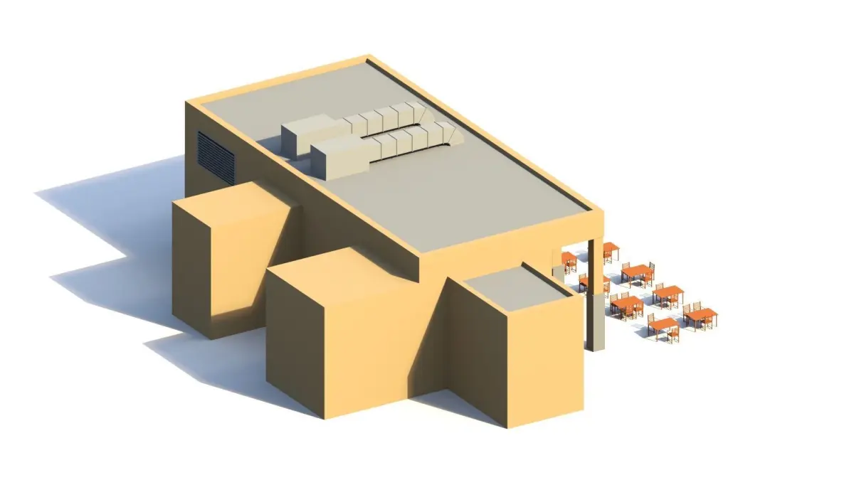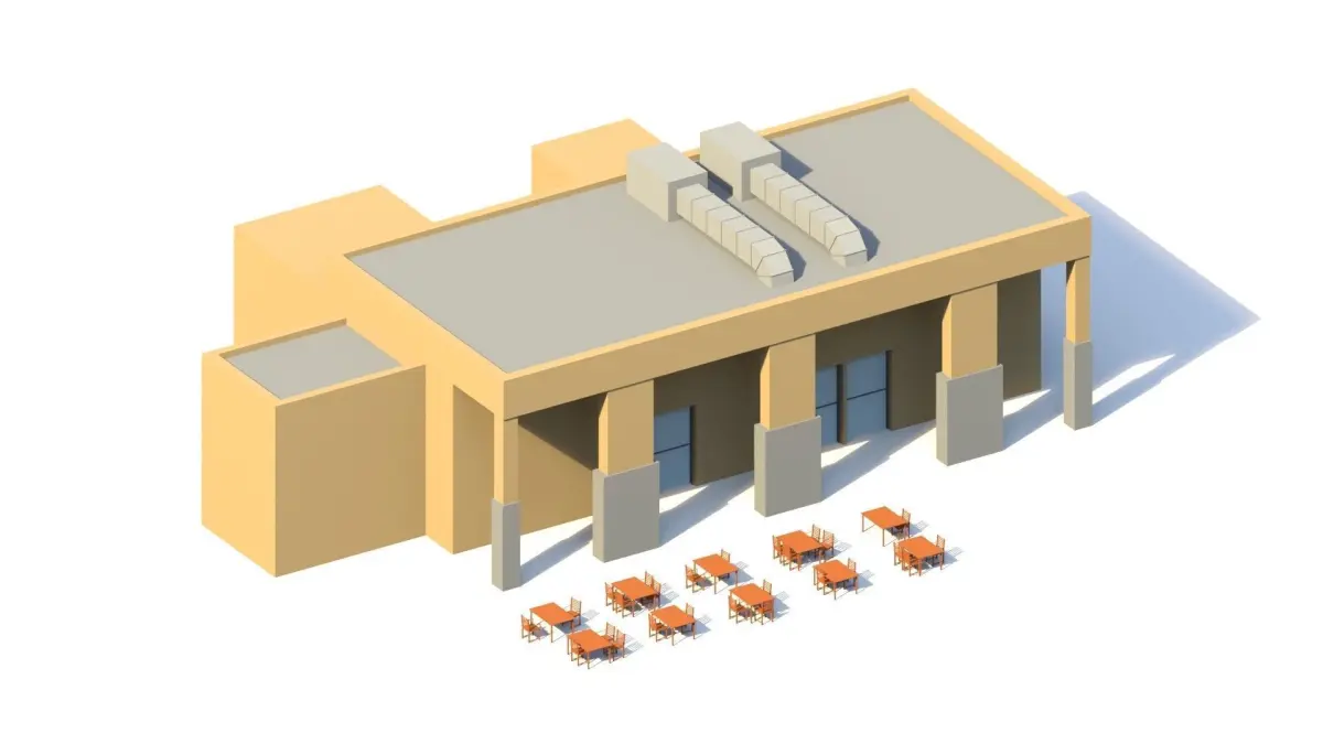 A low poly holiday restaurant building with wooden chairs and tables in front. See the preview images for day and night versions.