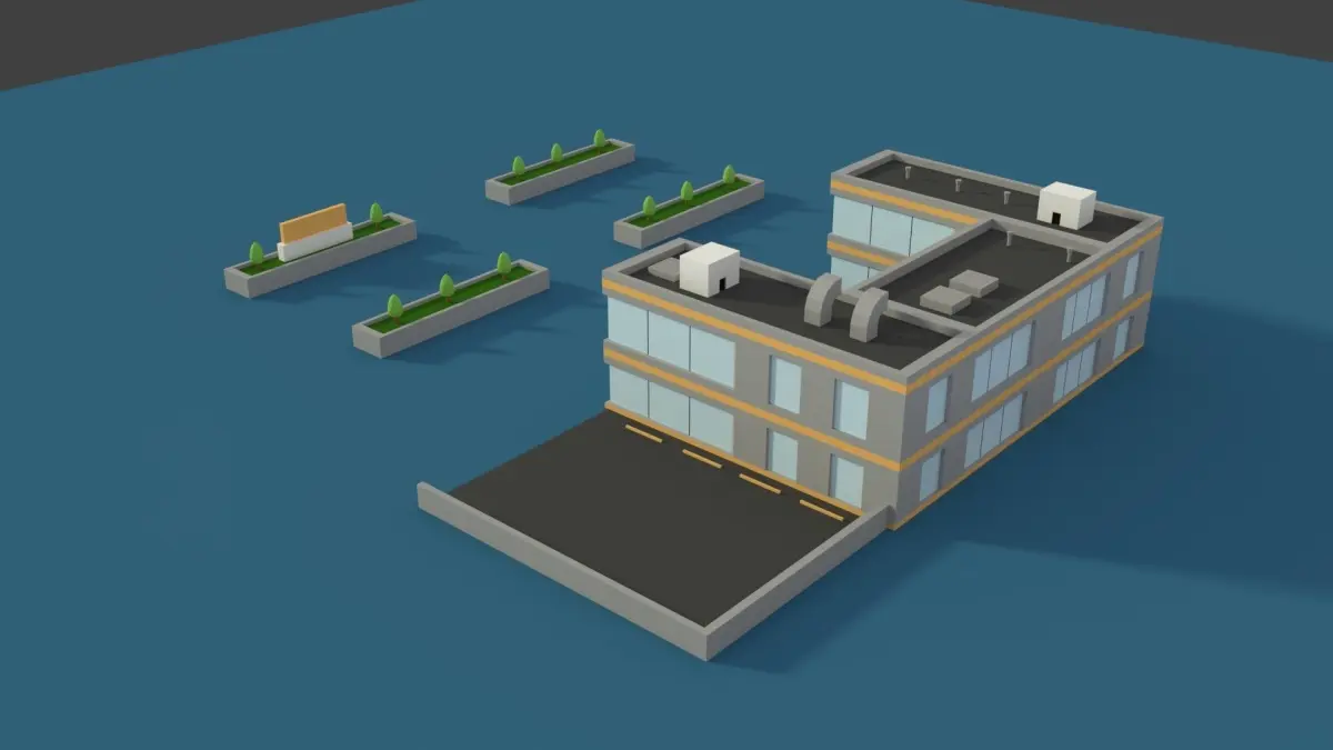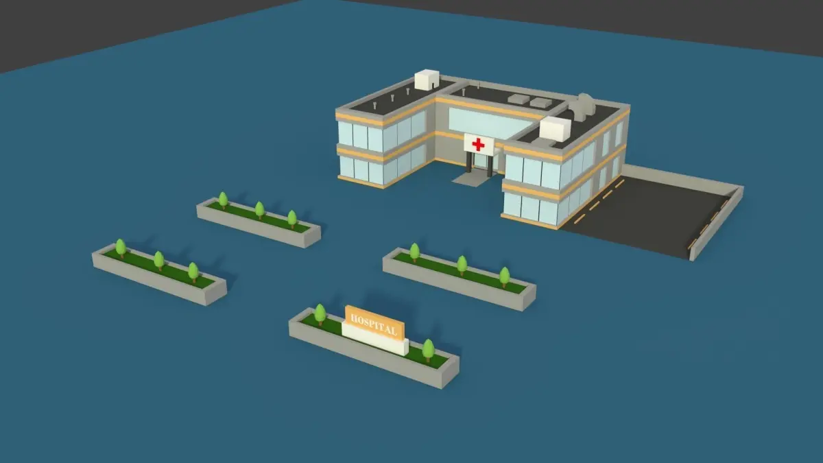 Low poly cartoony hospital building model with a parking lot. Also has some plants in front with a hospital sign. Check out the wireframe renders as well.