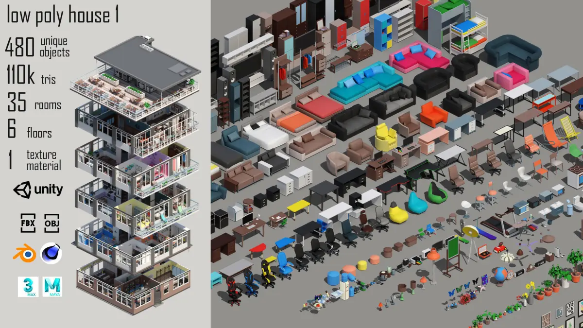files: unity package\ blender\ c4d\ maya\ 3dsmax\ fbx\ objlayers were created for each program, for convenient work, you can see it in the screenshots!