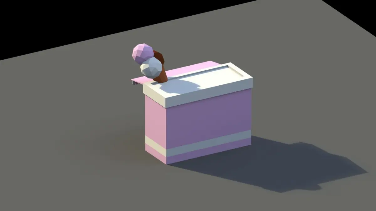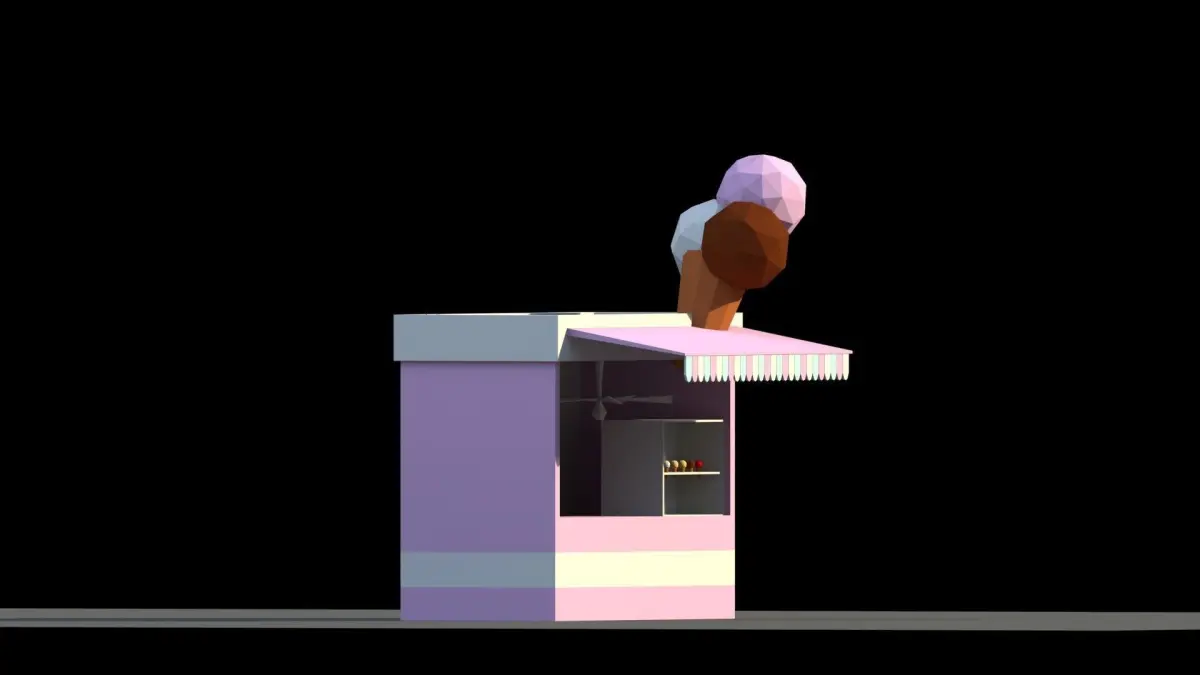 A pinkish ice cream stand with little ice cream cones in display. Also for night scenes there is a light on top with a fan. Check out the preview images to see night and day versions.