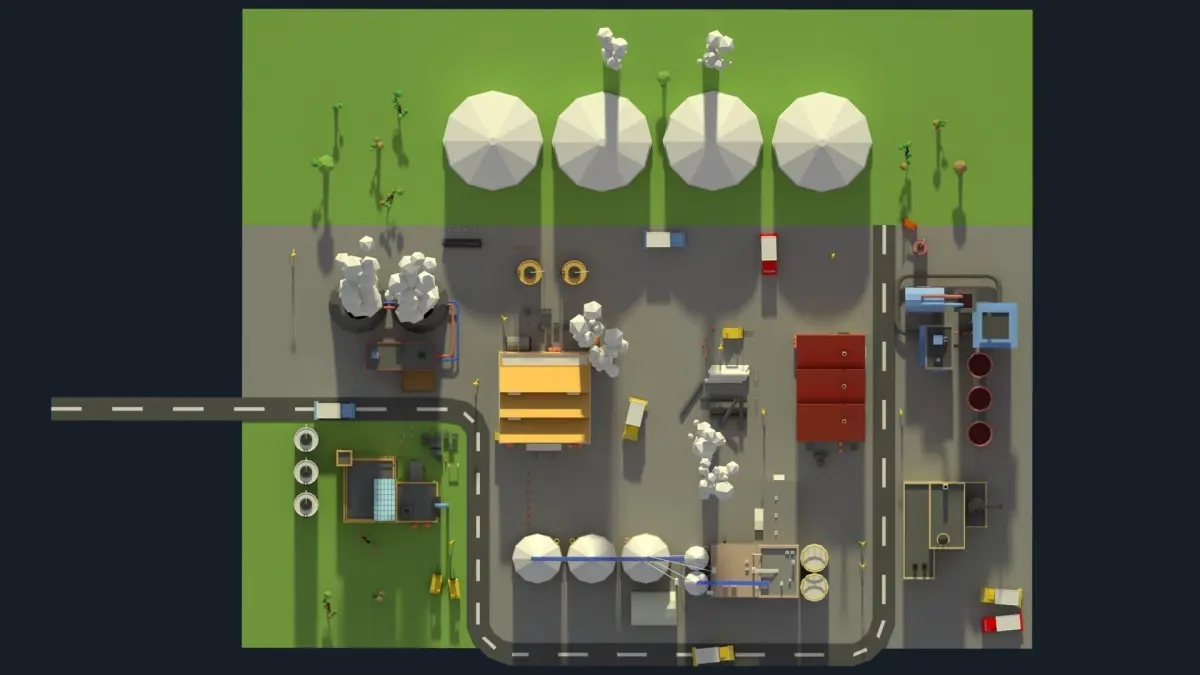 Low poly models of refineries, factories and feed plants with lights and smoke. Also contains 1 model of each one; truck(there are 3 variations with only difference being color), forklift(there are two forklifts in the scene, orange one is just smaller), industrial light, road cone, construction column, road block, fire extinguisher, barrel, crate.