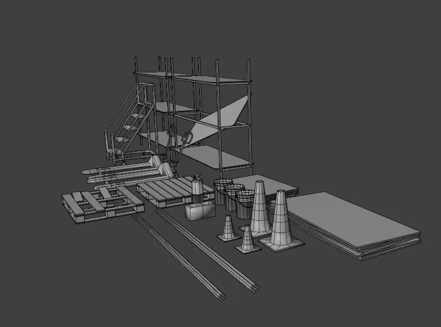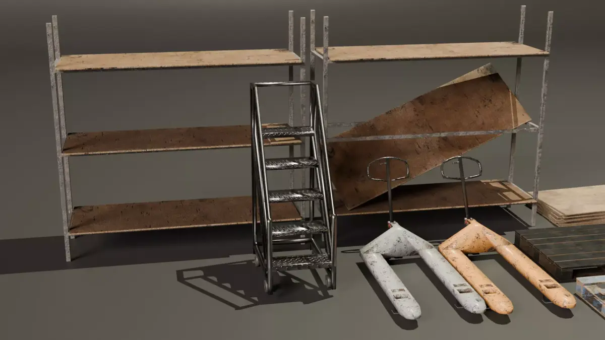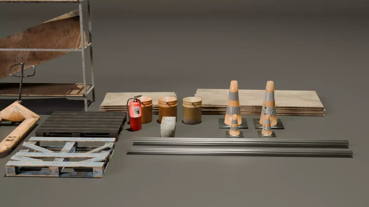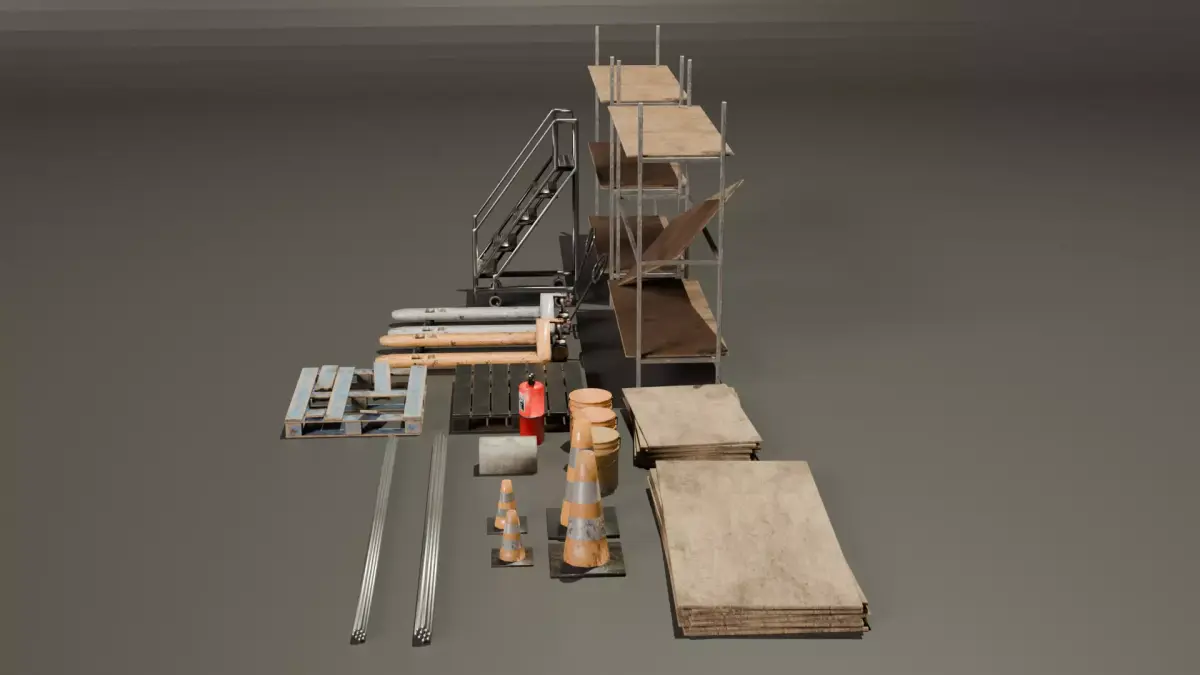 This is a Low poly industrial Pack contains, 2 Palet jacks, Ladder, 2 variations of shelves, 2 variations of palets, 4 variations of cones, 3 variations of 5gal buckets, 2 variations of wood stacks, 2 variations of pipe, fire extinguisher, and a cinder block.