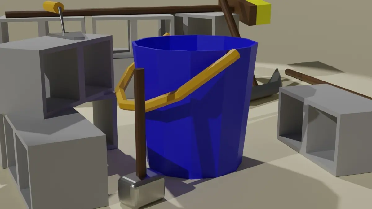 Set of industrial low poly tools. Includes: Bucket, hammer, broom. pickaxe, shovel, brick, trowel. Textures and materials are NOT included. All models are game ready. Modeling, animation and rendering are made in Blender.
