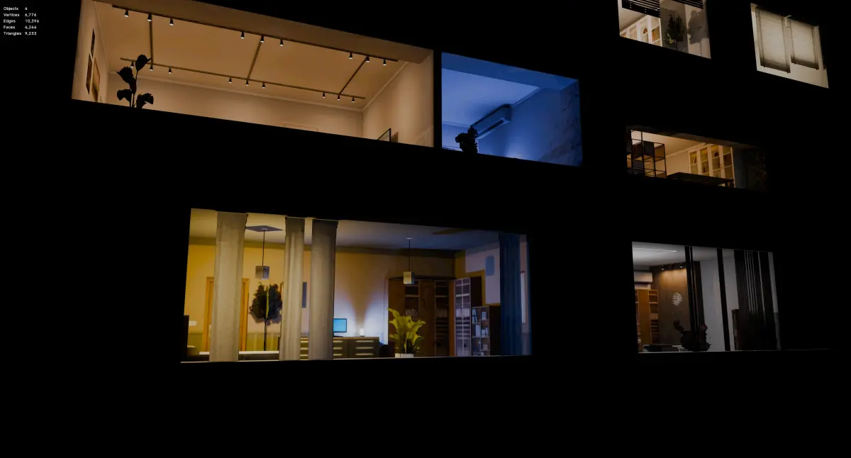 A set of residential and retail interiors, easily intergratable in scenes. Game-ready and optimised baked interiors with a variety of shapes and sizes. Includes day and night versions. The textures include 2 sets of emmisive maps included (native and light-baked)
