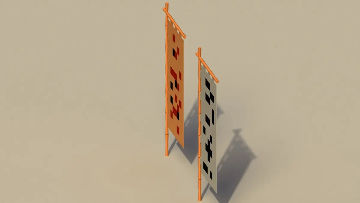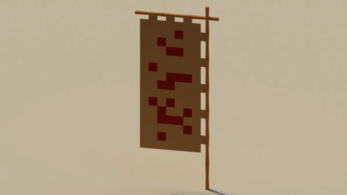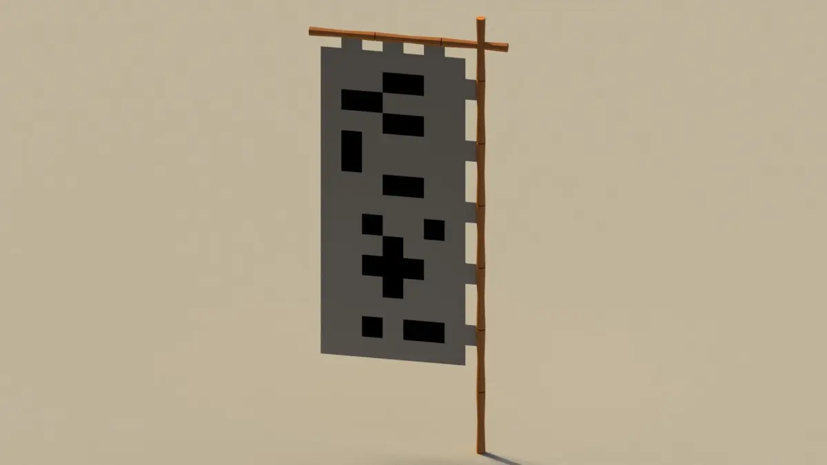 Old type of Japanese flag models with different colors and marking on them modeled in a low poly style.