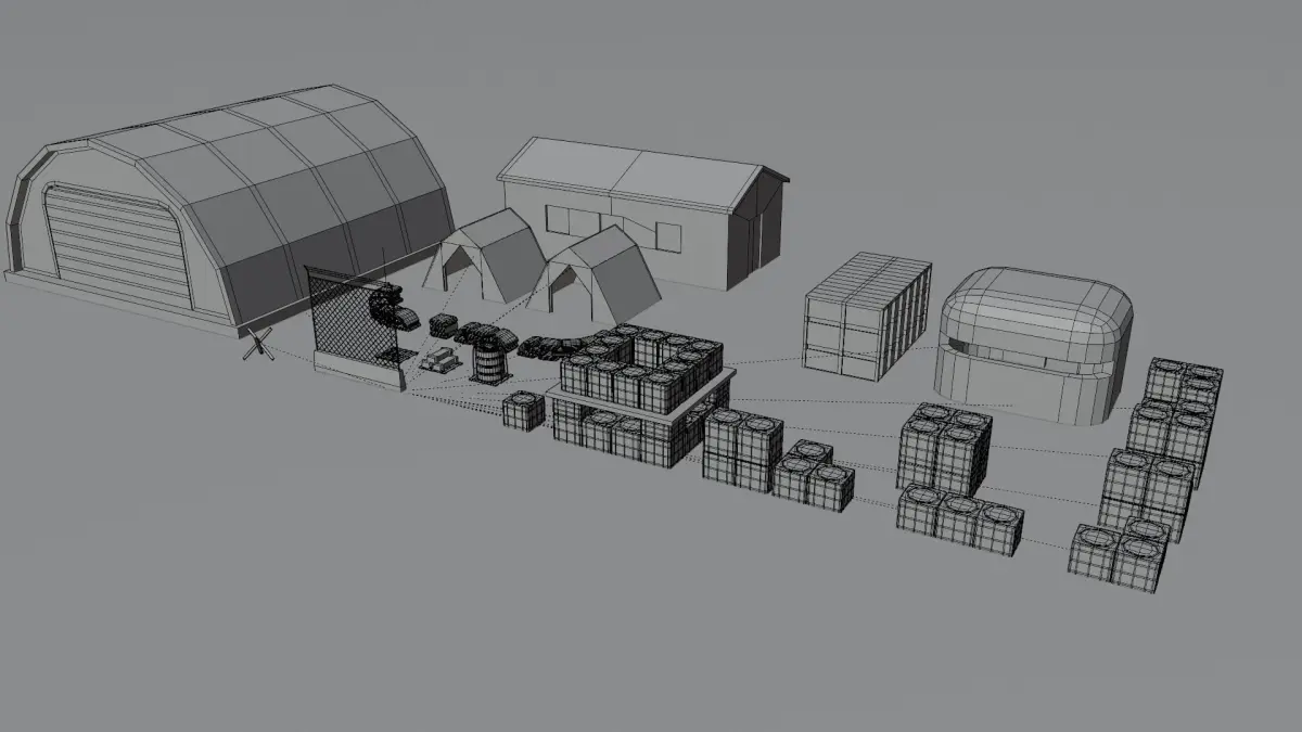 Low poly pack for military FOB. You have a hangar, bunker, tents, sandbags, and a lot of other things. Everything has a material. No textures, not even the bunker like on the images.