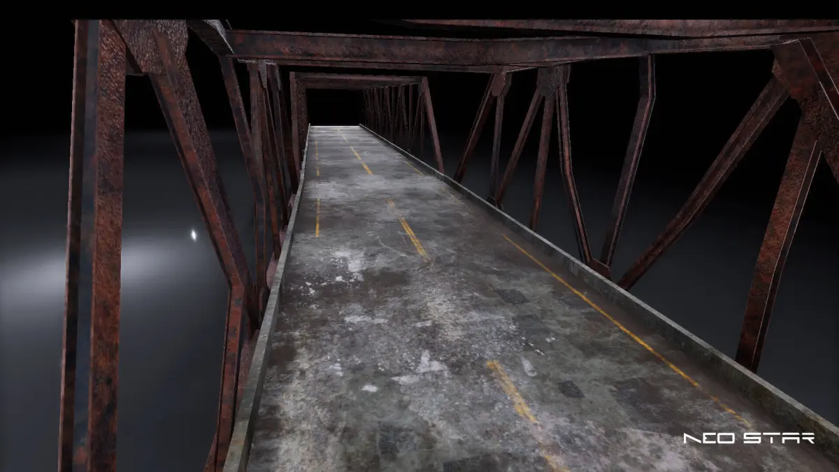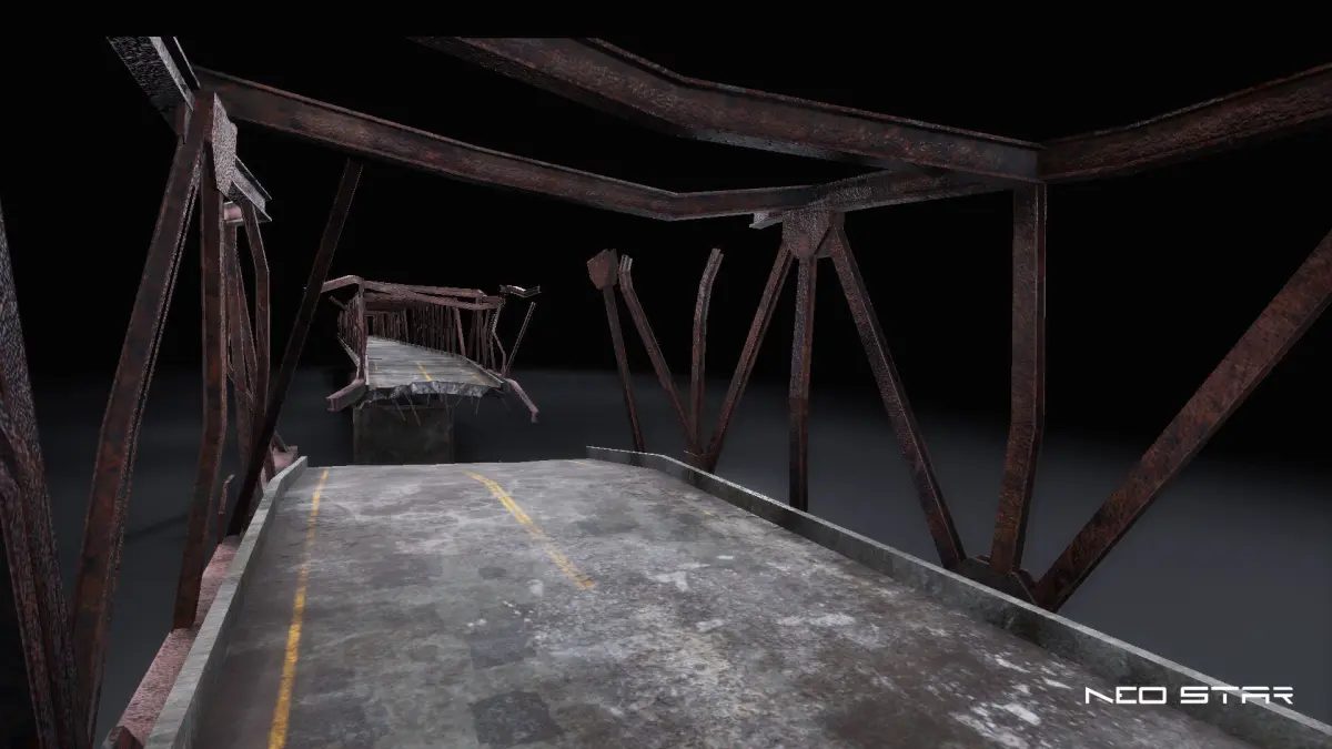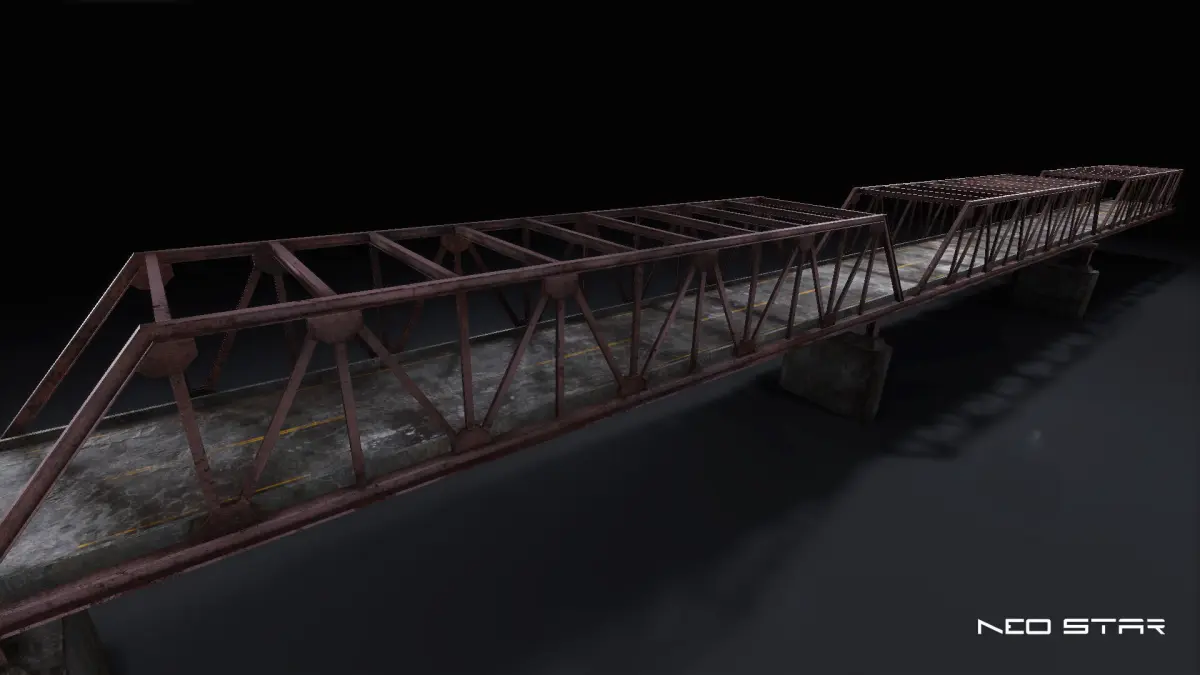 Modular broken bridge designed for use in games, ideal for post-apocalyptic and warzone environments. All the modular pieces share a single material to ensure optimal performance and to be easy to import into any game engine.