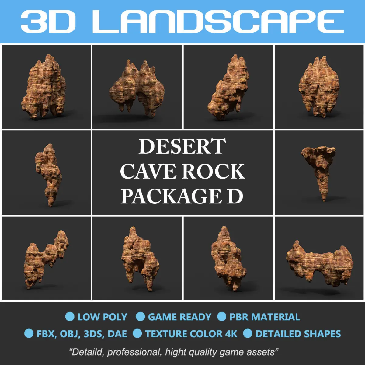 Cave desert rock 01: 8000 polys. Cave desert rock 02: 8000 polys. Cave desert rock 03: 10000 polys. Cave desert rock 04: 10000 polys. Cave desert rock 05: 5000 polys. Cave desert rock 06: 10000 polys. Cave desert rock 07: 5000 polys. Cave desert rock 08: 8000 polys. Cave desert rock 09: 8000 polys. Cave desert rock 10: 10000 polys.
