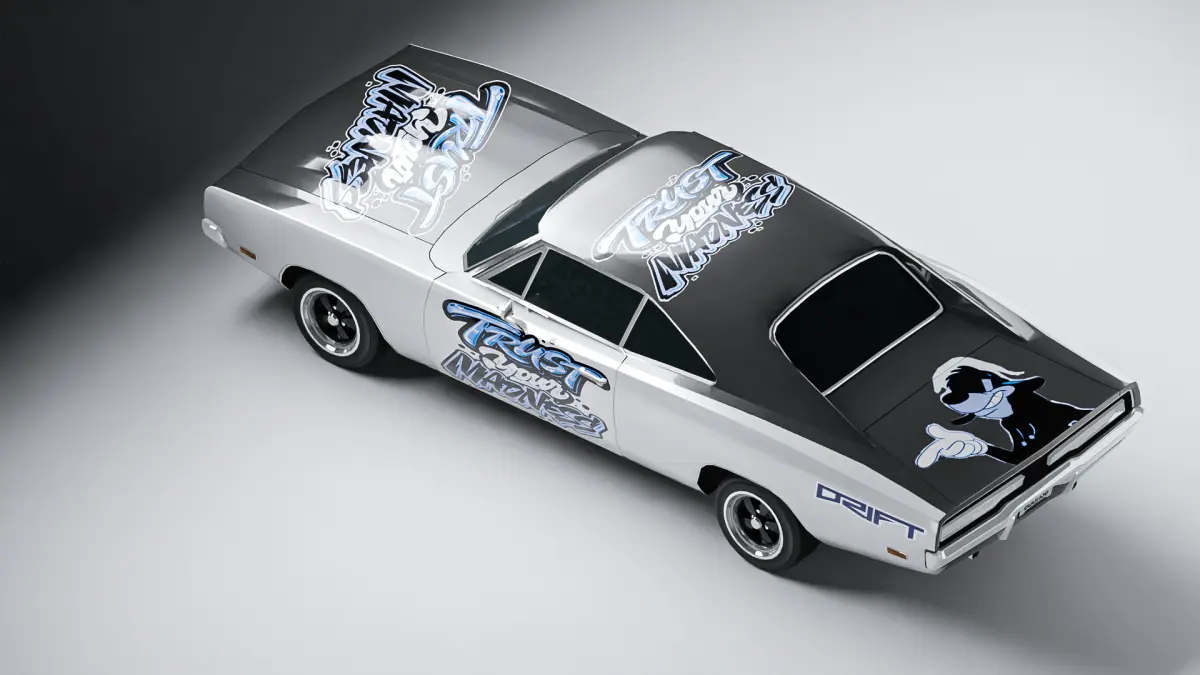 This stylized low poly muscle car features a clean design with a custom drift-themed livery that says Trust Your Madness. Perfect for racing, drift, or retro-themed game environments.
