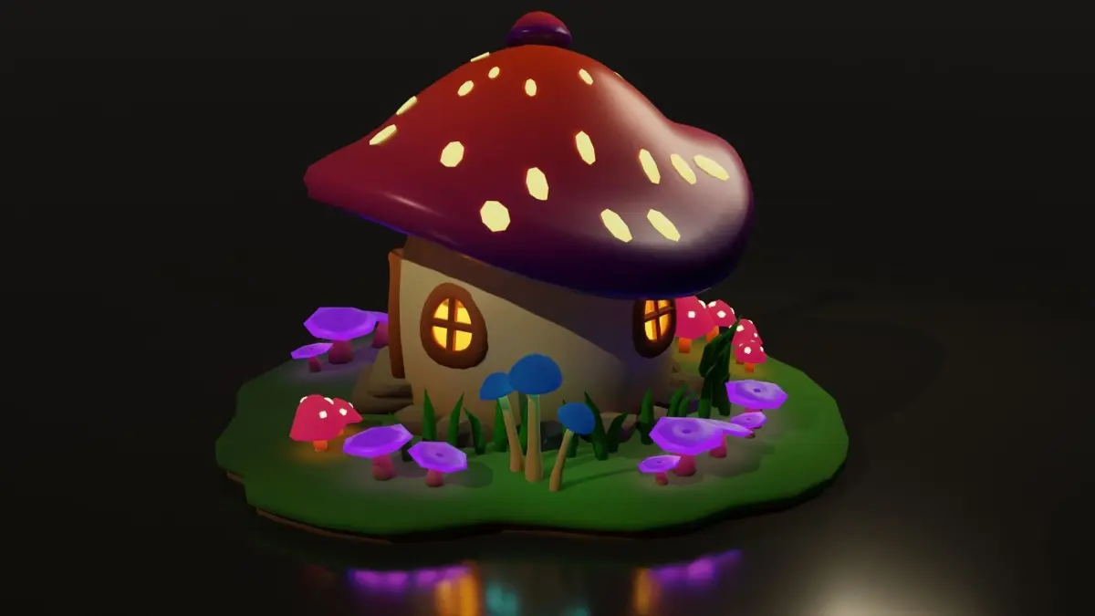 I created this Low poly Mushroom House using Blender 3.0.1. No texture used for this model.Door is openable.House, Door and Ground Are seprated objects.